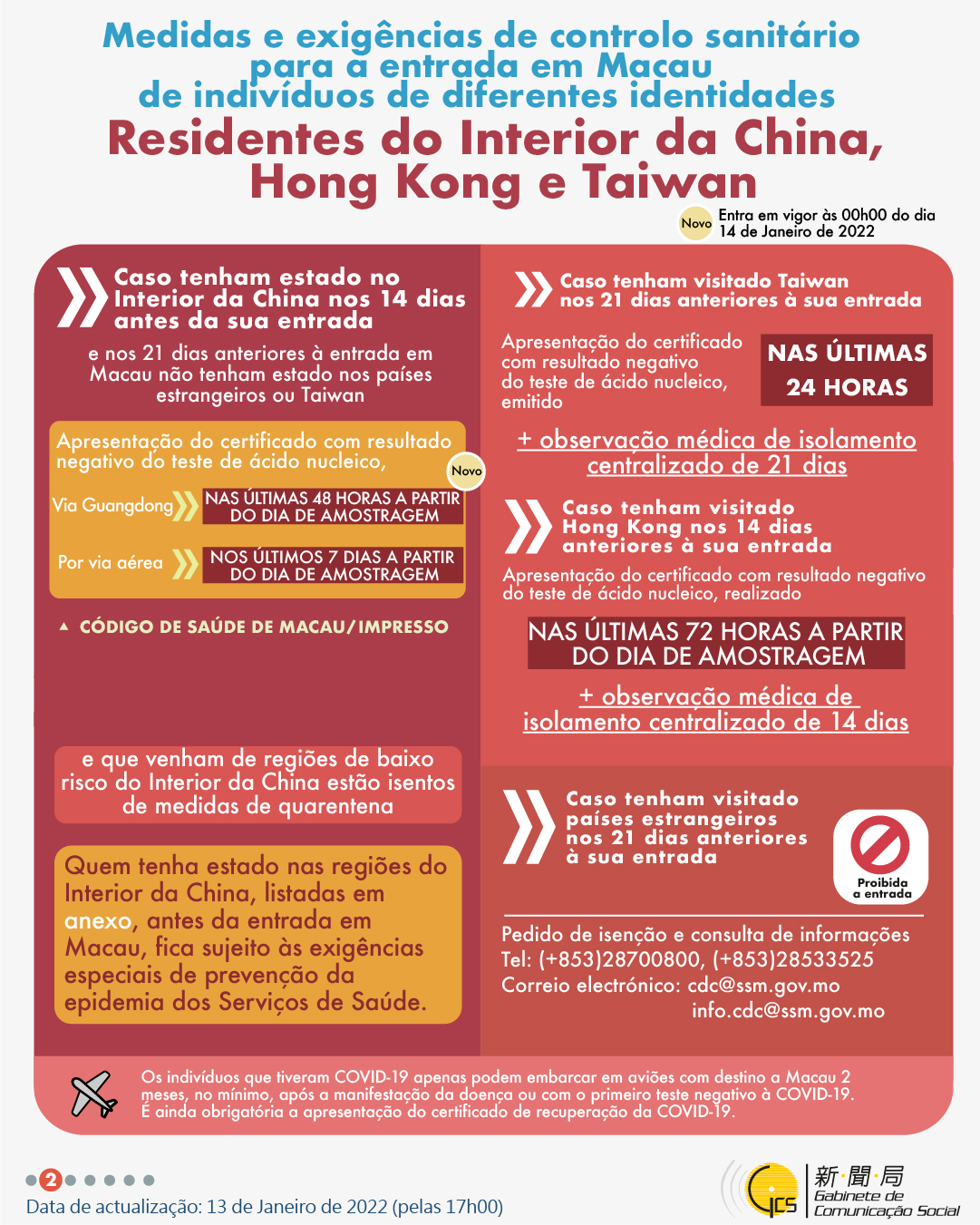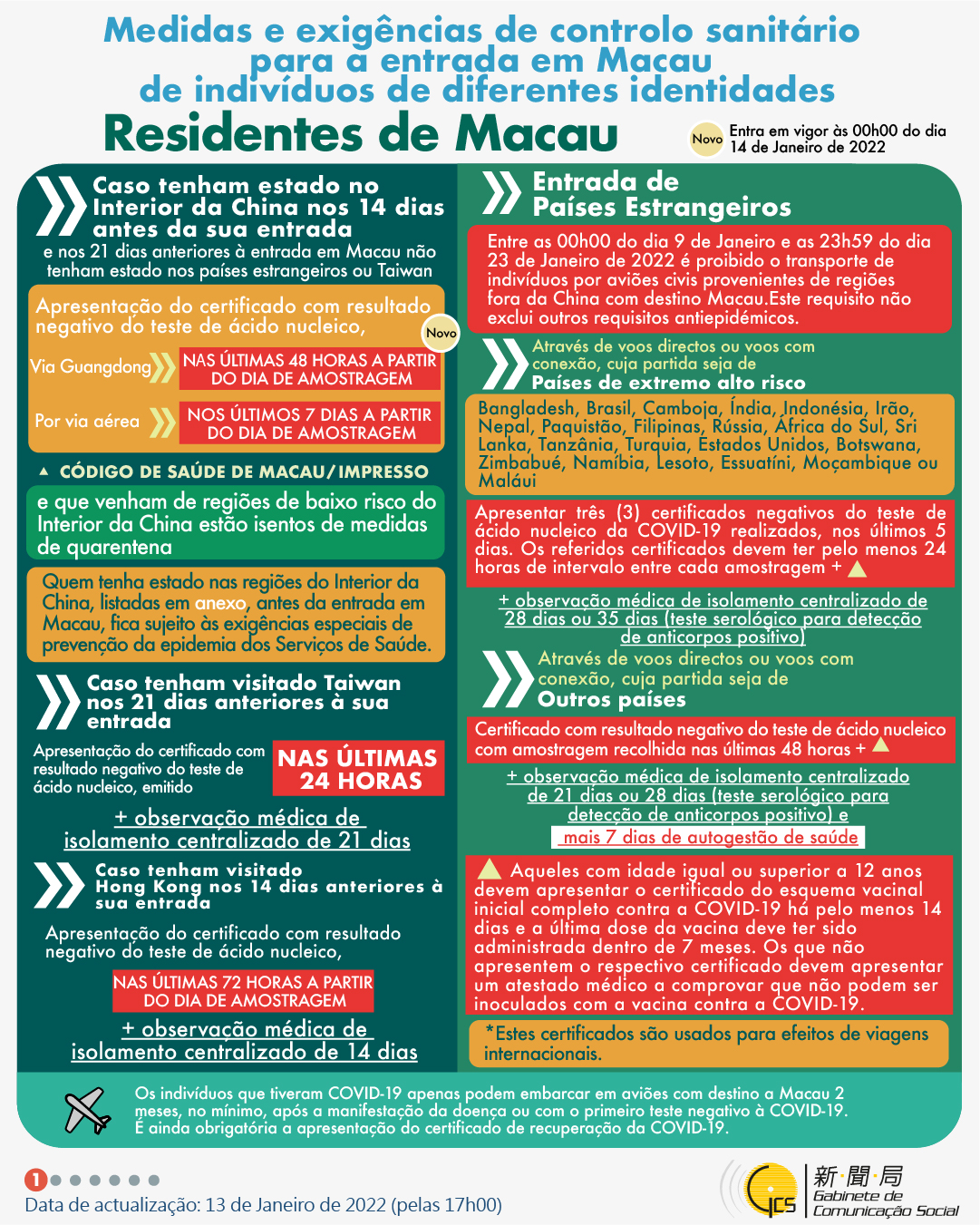 (Infografia)Medidas e exigências de controlo sanitário para a entrada em Macau de indivíduos de diferentes identidades, actualizadas no dia 13 de Janeiro de 2022