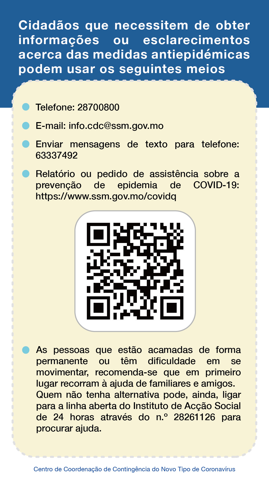 Em resposta às medidas acima referidas, os residentes que pretendam obter informações ou apoio além de poderem recorrer ao telefone (28700800) e correio electrónico ( info.cdc@ssm.gov.mo ) ou enviar mensagens de texto para o número telefónico 63337492, podem, ainda, recorrer à plataforma online de pedido de informações e apoio que foi criada pelas autoridades.