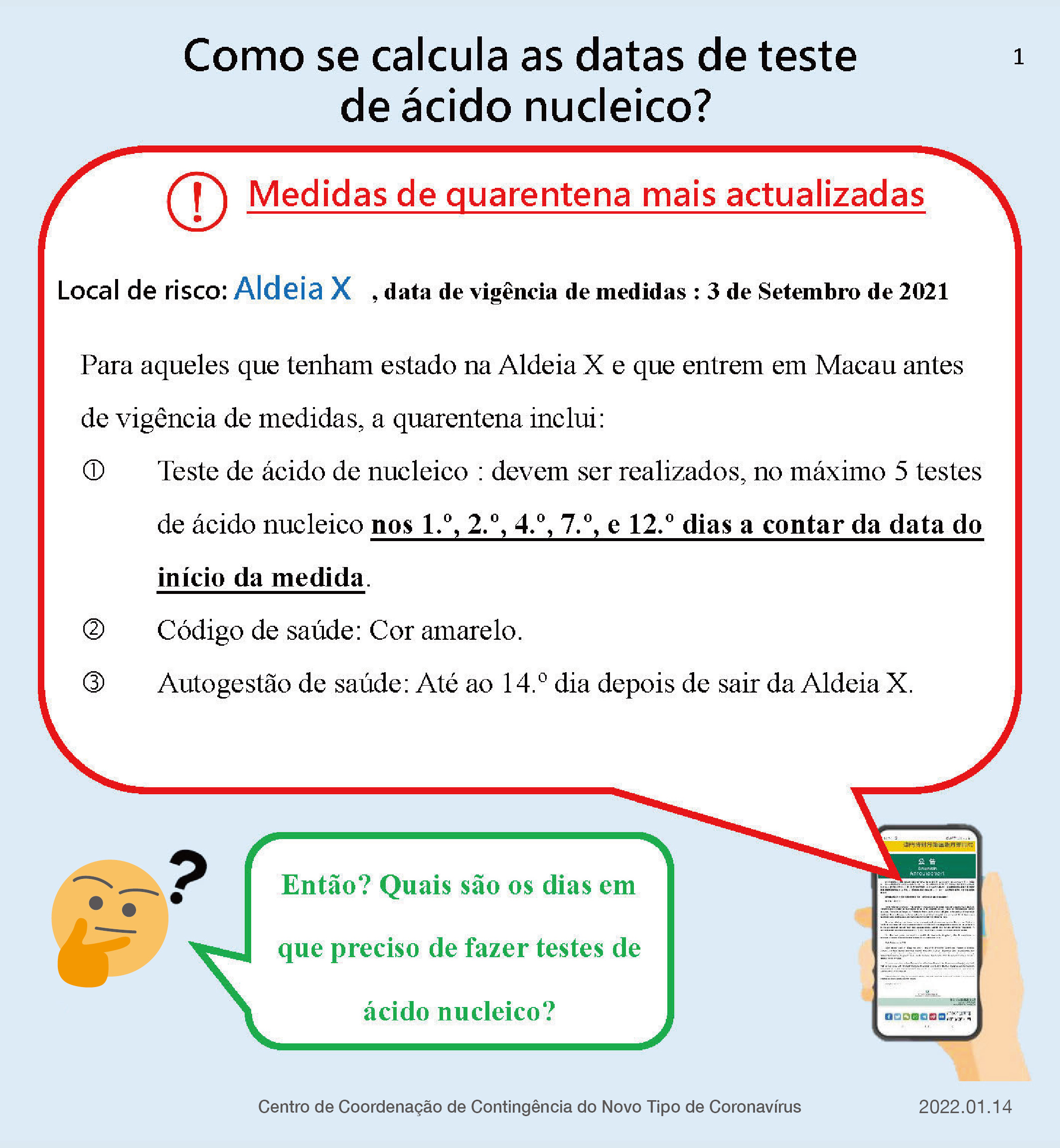 - Datas de realização de teste de ácido nucleico: A partir da data de vigência das medidas, precisa de ser sujeito até a 5 testes de ácido nucleico de novo tipo de coronavírus nos 1.º, 2.º, 4.º, 7.º e 12.º dias do período de autogestão da saúde, ou seja, as medidas entraram em vigor em 14 de Janeiro, um total de 5 testes de ácido nucleico serão realizados nos dias 14, 15, 17, 20 e 25 de Janeiro. No caso de saída do local relevante no dia 1 de Janeiro, a autogestão da saúde será realizada até 15 de Janeiro, ou seja, apenas um total de 2 testes de ácido nucleico devem ser realizados nos dias 14 e 15 de Janeiro.