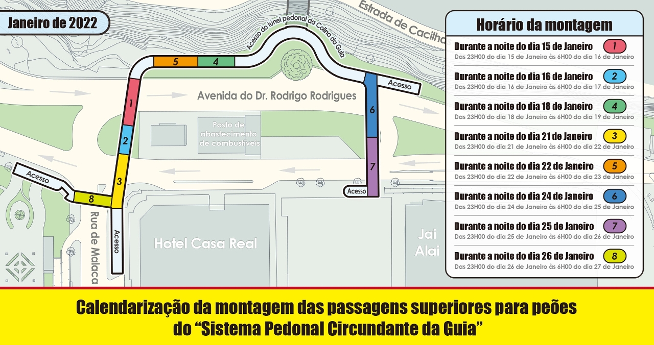 O acesso do extremo sul do túnel pedonal da Colina da Guia situa-se na Avenida do Dr. Rodrigo Rodrigues, onde estão a ser construídas duas passagens superiores para peões, uma de ligação à Rua de Malaca e outra ao passeio localizado entre o Jai Alai e o Hotel Casa Real. Houve atrasos na execução das obras de fundações por estacas nos acessos das passagens superiores devido a problemas com as canalizações existentes. Após o ajustamento da concepção de alguns acessos, as obras de fundações têm vindo gradualmente a ficar concluídas, podendo assim efectuar-se a montagem faseada da estrutura em aço das passagens superiores a partir de amanhã. A 1.ª fase da montagem abrangerá o troço junto ao posto de abastecimento de combustíveis Caltex, perto da Colina da Guia, e realizar-se-á das 11H00 da noite às 6H00 da manhã. Durante esse período serão tomadas medidas provisórias de condicionamento de trânsito, ficando um troço da Avenida do Dr. Rodrigo Rodrigues vedado ao tráfego. Os trabalhos de montagem das passagens serão divididos em oito fases e executados de madrugada, pretendendo-se conclui-los antes do Ano Novo Chinês.