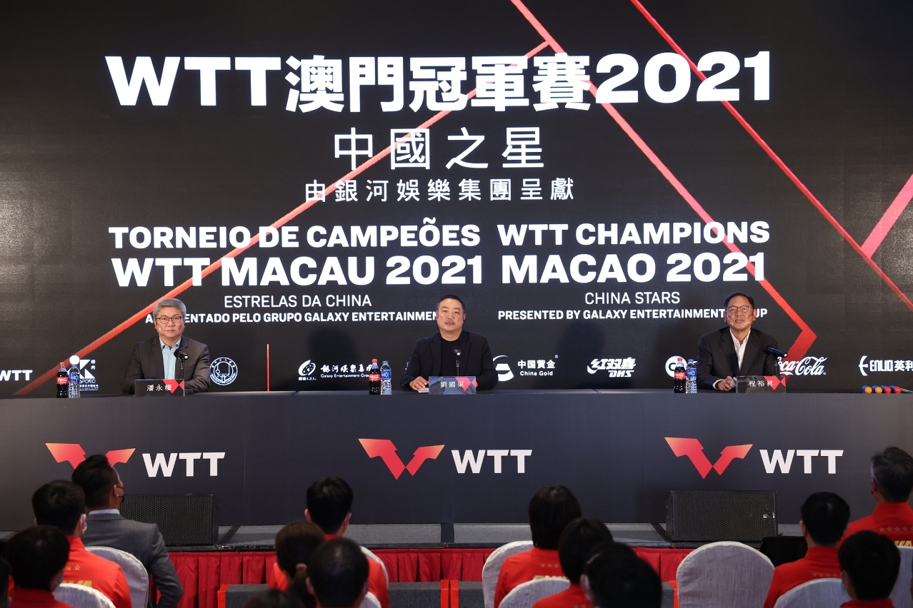 O Torneio de Campeões WTT Macau 2021 Estrelas da China, apresentado pelo Grupo Galaxy Entertainment, organizado pelo Instituto do Desporto do Governo da RAEM e pela World Table Tennis (WTT) e co-organizado pela Associação Geral de Ping-Pong de Macau, terá lugar de 19 a 23 no Pavilhão Polidesportivo do Tap Seac. E hoje (dia 18) realizou-se a Cerimónia de Sorteio, os convidados presentes incluíram: Presidente do Instituto do Desporto, Pun Weng Kun; Vice-Presidente da Federação Internacional de Ténis de Mesa, Presidente do Conselho da WTT e  Presidente da Associação Chinesa de Ténis de Mesa, Liu Guoliang; Director do Grupo Galaxy Entertainment, Philip Cheng, e os jogadores chineses, Ma Long, Fan Zhendong, Xu Xin, Chen Meng, Wang Manyu e Sun Yingsha, a jogadora polaca, Li Qian e o jogador de Macau, China, Cheong Chi Cheng e entre outros.