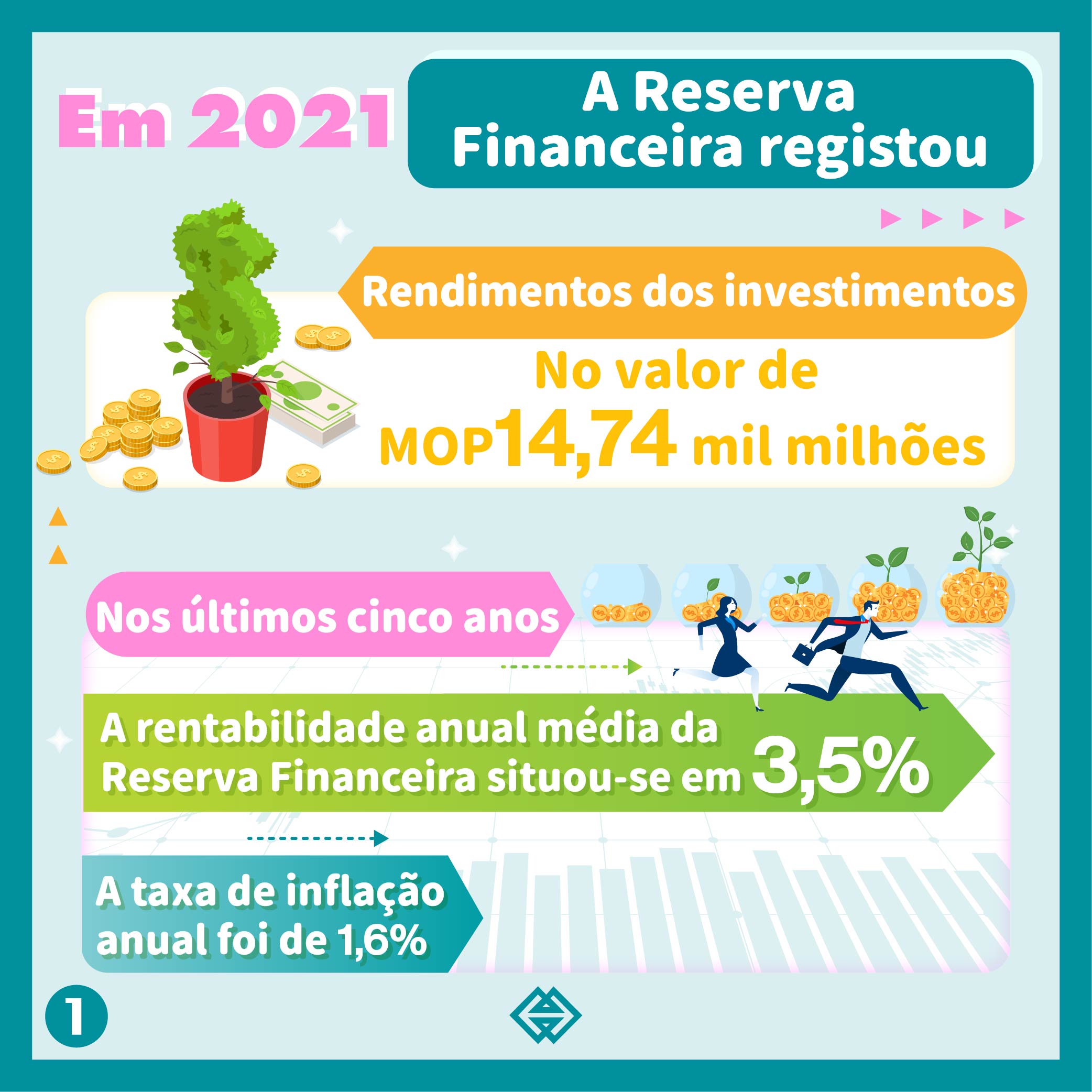 Em 2021, a Reserva Financeira da Região Administrativa Especial de Macau norteou-se pelo princípio da prudência em matéria da gestão dos investimentos, tendo registado rendimentos dos investimentos na ordem de 14,74 mil milhões de patacas (MOP), o que correspondeu a uma rentabilidade anual de 2,3%. Nos últimos cinco anos, a rentabilidade anual média da Reserva Financeira situou-se em 3,5%, enquanto que a média da taxa de inflação anual foi de 1,6%, em comparação com o período homólogo.