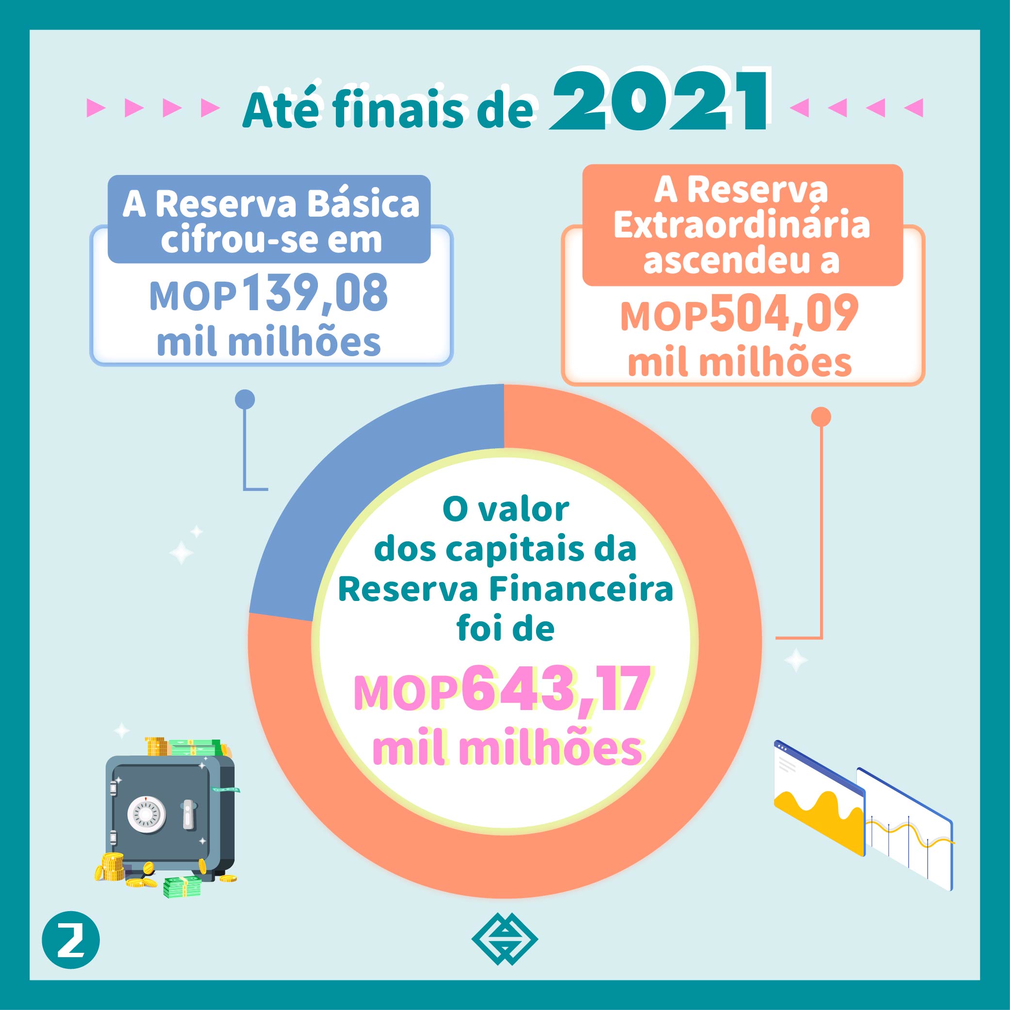 Até finais de 2021, o valor dos capitais da Reserva Financeira ascendeu a MOP643,17 mil milhões, dos quais a reserva básica representava MOP139,08 mil milhões e a reserva extraordinária MOP504,09 mil milhões.
