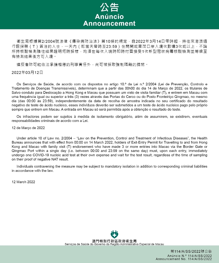 De modo a reduzir os eventuais riscos epidemiológicos causados pela circulação frequente de pessoas nas Portas do Cerco ou no Posto Fronteiriço Qingmao, os Serviços de Saúde, de acordo com os dispostos no artigo 10.º da Lei n.º 2/2004 (Lei de Prevenção, Controlo e Tratamento de Doenças Transmissíveis), determinam que a partir das 00h00 do dia 14 de Março de 2022, os titulares de Salvo-conduto para Deslocação a Hong Kong e Macau que possuam um visto de visita familiar (T), e entrem em Macau com uma frequência igual ou superior a três (3) vezes através das Portas do Cerco ou do Posto Fronteiriço Qingmao, no mesmo dia (das 00:00 às 23:59 do mesmo dia), independentemente da data de recolha de amostra indicada no seu certificado do resultado negativo de teste de ácido nucleico, esses indivíduos serão submetidos a um teste de ácido nucleico pago pelo próprio no momento da entrada em Macau e a entrada só será permitida após a obtenção do resultado do teste.