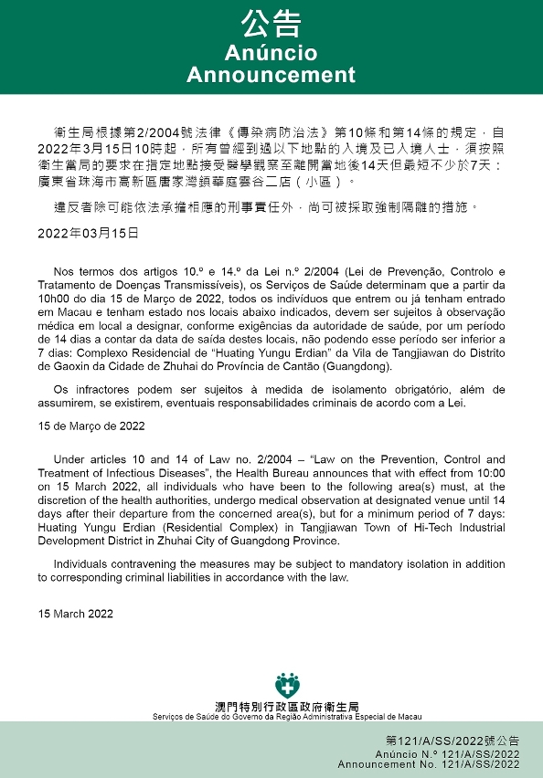 Tendo em consideração a evolução epidemiológica mais actualizada no Interior da China, os Serviços de Saúde, de acordo com os dispostos nos artigos 10.º e 14.º da Lei n.º 2/2004 (Lei de Prevenção, Controlo e Tratamento de Doenças Transmissíveis), determinam que a partir das 10h00 do dia 15 de Março de 2022, todos os indivíduos que entrem ou já tenham entrado em Macau e tenham estado nos locais abaixo indicados, devem ser sujeitos à observação médica em local a designar, conforme exigências da autoridade de saúde, por um período de 14 dias a contar da data de saída destes locais, não podendo esse período ser inferior a 7 dias: Complexo Residencial de “Huating Yungu Erdian” da Vila de Tangjiawan do Distrito de Gaoxin da Cidade de Zhuhai da Província de Cantão (Guangdong).