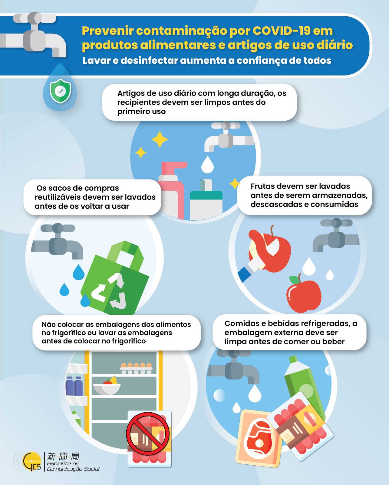 [Infografia]Prevenir contaminação por COVID-19 em produtos alimentares e artigos de uso diário - Lavar e desinfectar aumenta a confiança de todos