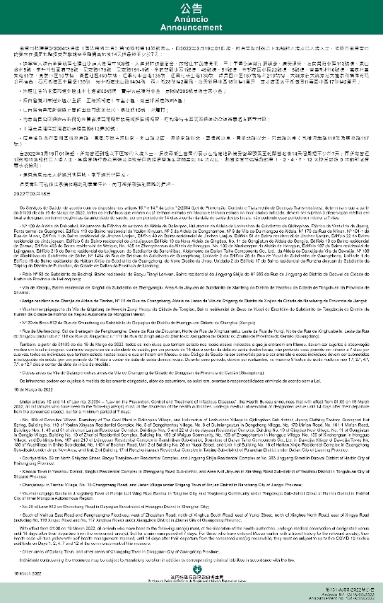 Também, a partir da 01h00 do dia 19 de Março de 2022, todos os indivíduos que tenham estado nos locais abaixo indicados e que já entraram em Macau, devem ser sujeitos à observação médica em local a designar, conforme exigências da autoridade de saúde, por um período de 14 dias a contar da data de saída destes locais, não podendo esse período ser inferior a 7 dias; por sua vez, todos os indivíduos que tenham estado nestes locais e que entraram em Macau, o seu Código de Saúde irá ser convertido para a cor amarela e esses indivíduos devem ser submetidos à autogestão da saúde, por um período de 14 dias a contar da data de saída desses locais. Durante esse período, devem ser realizados, no máximo 5 testes de ácido nucleico nos 1.º, 2.º, 4.º, 7.º, e 12.º dias a contar da data do início da medida: outras áreas da Vila de Dalang e outras áreas da Vila de Changping da Cidade de Dongguan da Província de Cantão (Guangdong).