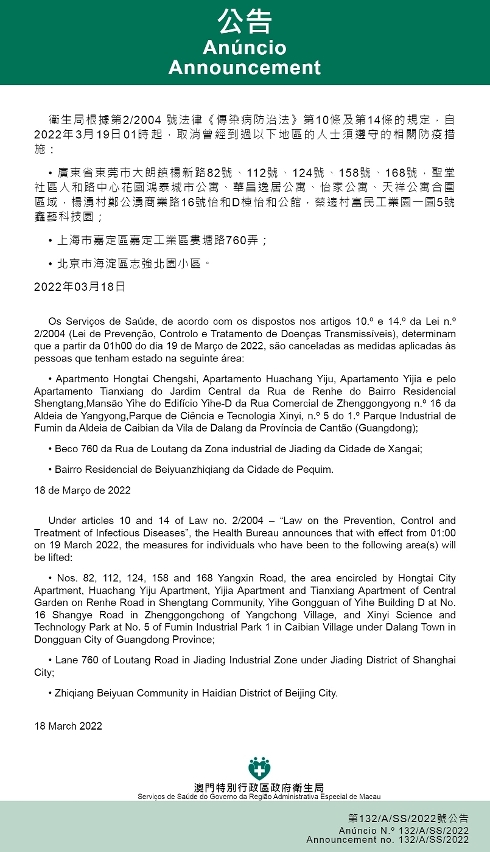 Anuncia-se, ainda, que a partir da 01h00 do dia 19 de Março de 2022, foram canceladas as medidas aplicadas às pessoas que tenham estado nas seguintes áreas devem observar as respectivas medidas antiepidémicas: N.º 82, Nº. 112, No. 124, No. 158, No. 168 da Rua Yangxin da Aldeia Dalang, Área circundada pelo Apartmento Hongtai Chengshi, Apartamento Huachang Yiju, Apartamento Yijia e pelo Apartamento Tianxiang do Jardim Central da Rua de Renhe do Bairro Residencial Shengtang,Mansão Yihe do Edifício Yihe-D da Rua Comercial de Zhenggongyong n.º 16 da Aldeia de Yangyong,Parque de Ciência e Tecnologia Xinyi, n.º 5 do 1.º Parque Industrial de Fumin da Aldeia de Caibian da Vila de Dalang da Província de Cantão (Guangdong); Beco 760 da Rua de Loutang da Zona industrial de Jiading da Cidade de Xangai; Bairro Residencial de Beiyuanzhiqiang da Cidade de Pequim.