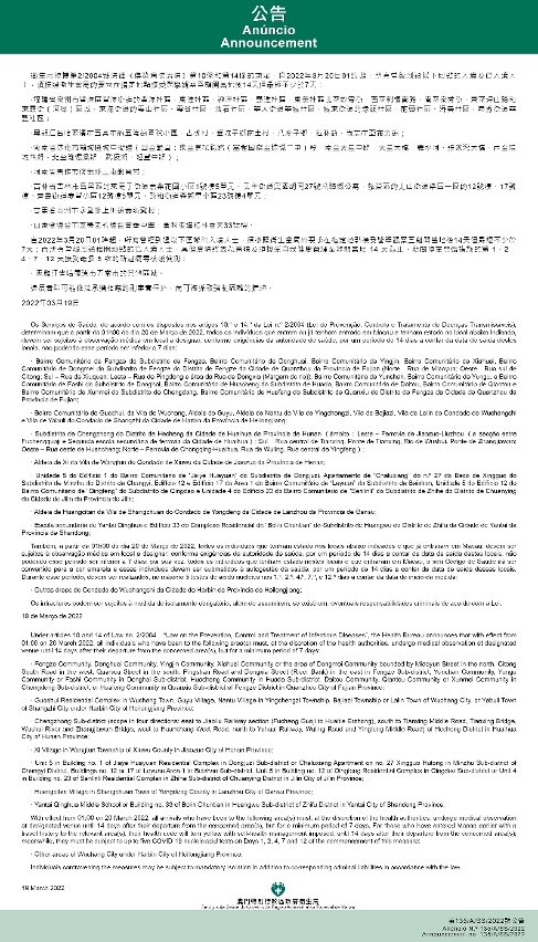 Tendo em consideração a evolução epidemiológica mais actualizada no Interior das China, os Serviços de Saúde, de acordo com os dispostos nos artigos 10.º e 14.º da Lei n.º 2/2004 (Lei de Prevenção, Controlo e Tratamento de Doenças Transmissíveis), determinam que a partir da 01h00 do dia 20 de Março de 2022, todos os indivíduos que entrem ou já tenham entrado em Macau e tenham estado nos locais abaixo indicados, devem ser sujeitos à observação médica em local a designar, conforme exigências da autoridade de saúde, por um período de 14 dias a contar da data de saída destes locais, não podendo esse período ser inferior a 7 dias: