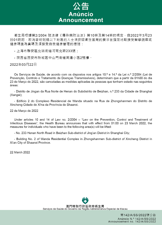 Anuncia-se, ainda, que a partir da 01h00 do dia 23 de Março de 2022, foram canceladas as medidas aplicadas às pessoas que tenham estado nas seguintes áreas devem observar as respectivas medidas antiepidémicas: Distrito de Jingan da Rua Norte de Henan do Subdistrito de Beizhan, n.º 233 da Cidade de Shanghai (Xangai);Edifício 2 do Complexo Residencial de Wanda situado na Rua de Zhongshanmen do Distrito de Xincheng Cidade de Xi'na da Província de Shaanxi.