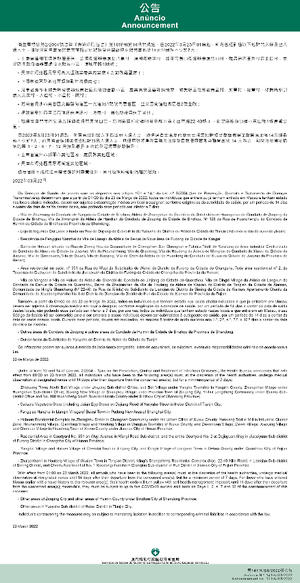 Tendo em consideração a evolução epidemiológica mais actualizada no Interior das China, os Serviços de Saúde, de acordo com os dispostos nos artigos 10.º e 14.º da Lei n.º 2/2004 (Lei de Prevenção, Controlo e Tratamento de Doenças Transmissíveis), determinam que a partir da 01h00 do dia 23 de Março de 2022, todos os indivíduos que entrem ou já tenham entrado em Macau e tenham estado nos locais abaixo indicados, devem ser sujeitos à observação médica em local a designar, conforme exigências da autoridade de saúde, por um período de 14 dias a contar da data de saída destes locais, não podendo esse período ser inferior a 7 dias: