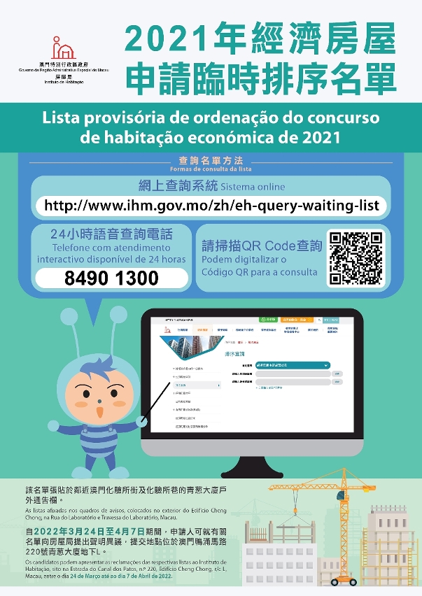 Em articulação com os trabalhos de prevenção da epidemia, o IH apela aos candidatos a utilizarem o sistema electrónico de consulta ( http://www.ihm.gov.mo/pt/eh-query-waiting-list ), da conta de WeChat e do telefone com atendimento interactivo disponível 24 horas (8490 1300) para consultarem a sua candidatura. Os que optaram pela consulta presencial devem usar máscara, medir a temperatura corporal, mostrar o código de saúde com a cor verde e efectuar a leitura do Código QR do estabelecimento.