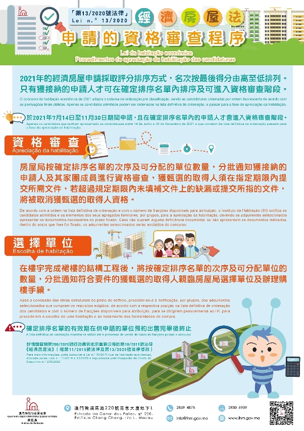O período em que decorreu o presente concurso foi de 14 de Julho a 30 de Novembro de 2021, durante este período foram recebidos 11 707 boletins de candidatura, sendo este o primeiro concurso público após a alteração da “Lei da habitação económica”, tendo sido alterado para o sistema de ordenação por classificação. Findo o prazo de entrega dos documentos em falta, o IH elaborou a lista provisória de ordenação das candidaturas admitidas em função da classificação atribuída e a lista de exclusão de candidaturas.