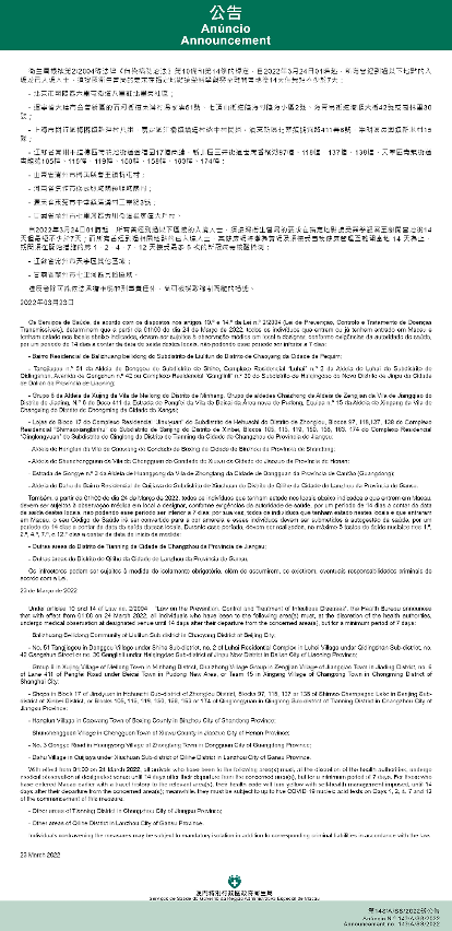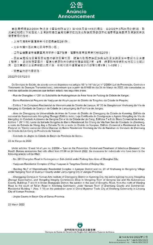 Tendo em consideração a evolução epidemiológica mais actualizada no Interior das China, os Serviços de Saúde, de acordo com os dispostos nos artigos 10.º e 14.º da Lei n.º 2/2004 (Lei de Prevenção, Controlo e Tratamento de Doenças Transmissíveis), determinam que a partir da 01h00 do dia 24 de Março de 2022, todos os indivíduos que entrem ou já tenham entrado em Macau e tenham estado nos locais abaixo indicados, devem ser sujeitos à observação médica em local a designar, conforme exigências da autoridade de saúde, por um período de 14 dias a contar da data de saída destes locais, não podendo esse período ser inferior a 7 dias: Bairro Residencial de Balizhuang beilidong do Subdistrito de Liulitun do Distrito de Chaoyang da Cidade de Pequim; Tangjiagou n.º 51 da Aldeia de Donggou do Subdistrito de Shihe, Complexo Residencial “Luhai” n.º 2 da Aldeia de Luhai do Subdistrito de Qidingshan, Avenida de Gangshun n.º 42 ou Complexo Residencial “Ganglinli” n.º 30 do Subdistrito de Haiqingdao do Novo Distrito de Jinpu da Cidade de Dalian da Província de Liaoning; Grupo 8 da Aldeia de Xujing da Vila de Meilong do Distrito de Minhang, Grupo de aldeões Chaizhong da Aldeia de Zengjian da Vila de Jiangqiao do Distrito de Jiading, N.º 6 do Beco 411 da Estrada de Pengfei da Vila de Beicai da Área nova de Pudong, Equipa n.º 15 da Aldeia de Xingang da Vila de Changxing do Distrito de Chongming da Cidade de Xangai; Lojas do Bloco 17 do Complexo Residencial “Jinxiyuan” do Subdistrito de Hehuachi do Distrito de Zhonglou, Blocos 97, 118,137, 138 do Complexo Residencial “Shimaoxiangbinhu” do Subdistrito de Sanjing do Distrito de Xinbei, Blocos 105, 115, 119, 150, 158, 163, 174 do Complexo Residencial “Qinglongyuan” do Subdistrito de Qinglong do Distrito de Tianning da Cidade de Changzhou da Província de Jiangsu; Aldeia de Hangtun da Vila de Caowang do Condado de Boxing da Cidade de Binzhou da Província de Shandong; Aldeia de Shunchengguan da Vila de Chengguan do Condado de Xiuwu da Cidade de Jiaozuo da Província de Henan; Estrada de Gongye n.º 3 da Aldeia de Huangyong da Vila de Zhongtang da Cidade de Dongguan da Província de Cantão (Guangdong); Aldeia de Dahu do Bairro Residencial de Cuijiaya do Subdistrito de Xiuchuan do Distrito de Qilihe da Cidade de Lanzhou da Província de Gansu.