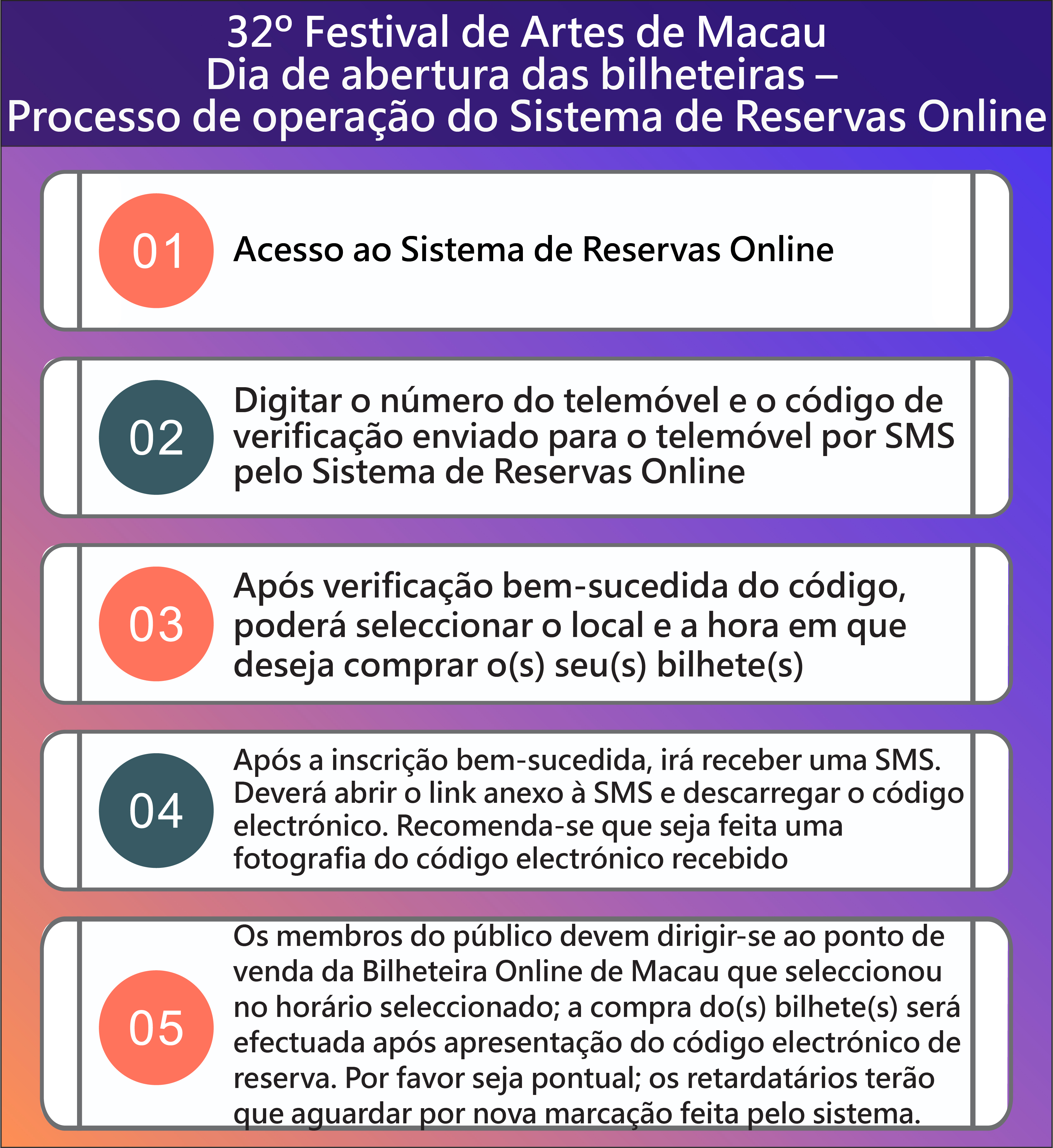 A fim de cumprir com as exigências impostas pelos trabalhos de prevenção da pandemia, a aperfeiçoar o sistema de aquisição de bilhetes para o Festival de Artes de Macau e a proporcionar condições que permitam incentivar a população a aproveitar melhor a comodidade trazida pelos serviços de Governação Electrónica, o IC lança diversos canais de venda de bilhetes no dia de abertura das bilheteiras, bem como bilheteiras físicas e virtuais. Além disso, o Sistema de Reservas Online para o dia de abertura das bilheteiras estará disponível em simultâneo. Os membros do público que pretendam comprar bilhetes pessoalmente nos balcões no dia de abertura das bilheteiras, entre as 10:00 horas e as 13:00 horas, devem efectuar a respectiva inscrição no referido sistema com o seu número de telemóvel, a partir das 10:00 horas do dia 31 de Março (Quinta-feira), e aqueles cuja inscrição for bem sucedida podem seleccionar um horário específico para aquisição e levantamento de bilhetes, bastando posteriormente dirigirem-se ao local no horário indicado. Os interessados que necessitem de assistência na utilização do Sistema de Reservas Online podem deslocar-se pessoalmente a qualquer balcão da Bilheteira Online de Macau, para serem assistidos por um funcionário, durante o período de abertura do sistema e durante o horário de funcionamento desses balcões. Devido ao limitado número de lugares disponíveis no período de marcação, as inscrições serão feitas por ordem de chegada, sendo cada número de telemóvel registado apenas uma vez. Os interessados que pretendam reservar o seu bilhete por telefone ou pela plataforma online convencional, não necessitam de efectuar qualquer inscrição prévia. No primeiro dia de venda, para todos os espectáculos, há um limite máximo de seis bilhetes por espectáculo por pessoa, com excepção do concerto Liza Wang com a Orquestra Chinesa de Macau, para o qual é permitido um número máximo de quatro bilhetes por sessão e por pessoa.