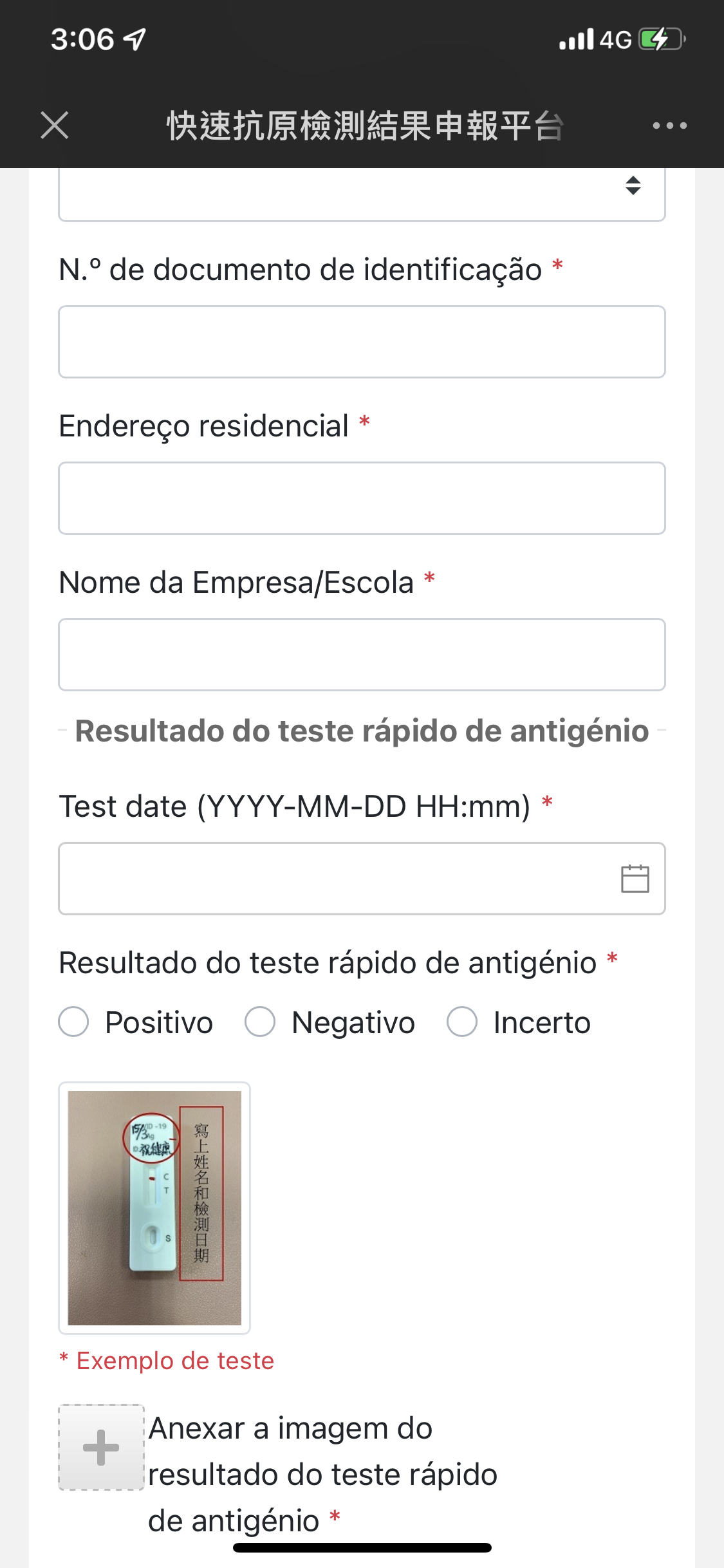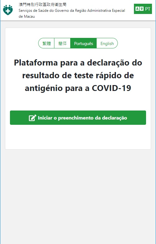 Os cidadãos podem carregar os resultados dos testes rápidos de antigénio (doravante designado por resultado do teste) através da ligação https://app.ssm.gov.mo/generalrat (vide imagem 3) da “Plataforma de declaração do resultado do teste rápido de antigénio para a COVID-19” na parte inferior da página inicial do “Código de Saúde de Macau”, com a indicação de “negativo”, “positivo” ou “incerto” (vide imagem 4), sendo que os resultados relevantes serão exibidos no Código de Saúde de Macau após o seu carregamento. Se o resultado do teste for “negativo”, o texto do teste rápido de antigénio será indicado a azul e o código QR do Código de Saúde será exibido com a cor verde. Se o resultado do teste for “positivo” será usada a cor vermelha no texto e no código QR do Código de Saúde. Se o resultado do teste for “incerto” não será exibida nenhuma informação. Além disso, apenas será exibido o resultado do teste dos últimos três dias e, se houver vários resultados dos testes, será exibido o mais recente.