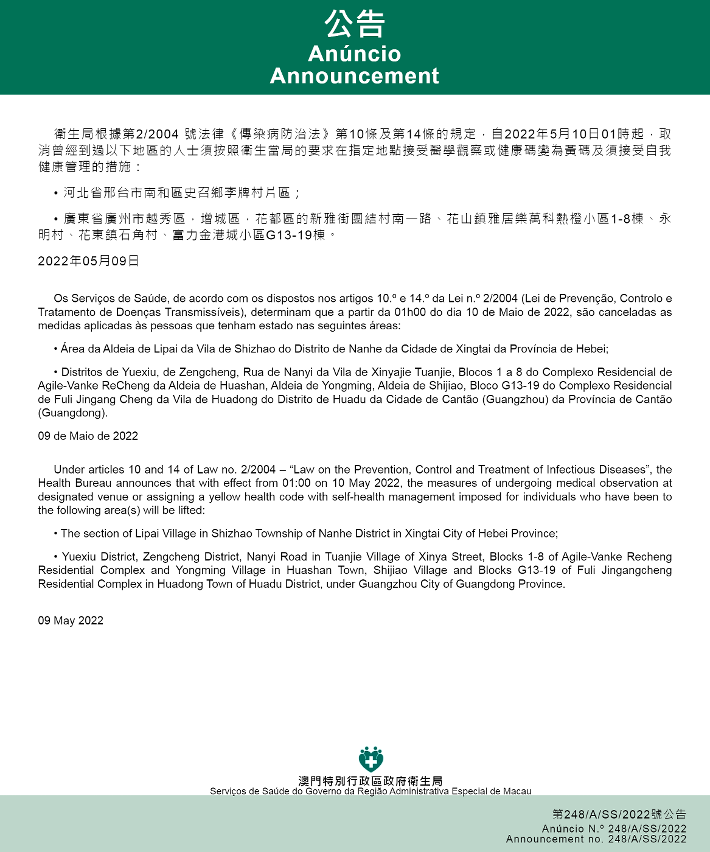 A partir da 01h00 do dia 10 de Maio de 2022 implementação e cancelamento de medidas antiepidémicas para quem tenha estado em diversas áreas do Interior da China