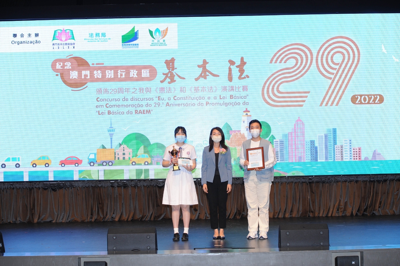 Dando continuidade à promoção da “Constituição” e da “Lei Básica” junto dos alunos e dos jovens, foi realizada, com sucesso, no dia 15 de Maio, no auditório da Escola São Paulo, a prova final do Concurso de Discursos “Eu, a Constituição e a Lei Básica”, no âmbito da Comemoração do 29.º Aniversário da Promulgação da “Lei Básica da Região Administrativa Especial de Macau”. O Concurso foi organizado, conjuntamente, pela Associação de Divulgação da Lei Básica de Macau, pela Direcção dos Serviços de Assuntos de Justiça (DSAJ), pela Direcção dos Serviços de Educação e de Desenvolvimento da Juventude (DSEDJ) e pelo Instituto para os Assuntos Municipais (IAM). Para articular com os trabalhos de prevenção epidémica e evitar a concentração de pessoas, esta edição do concurso foi mais reduzida, optando-se pela sua transmissão online e em directo para que os professores e os colegas dos candidatos os pudessem apoiar.