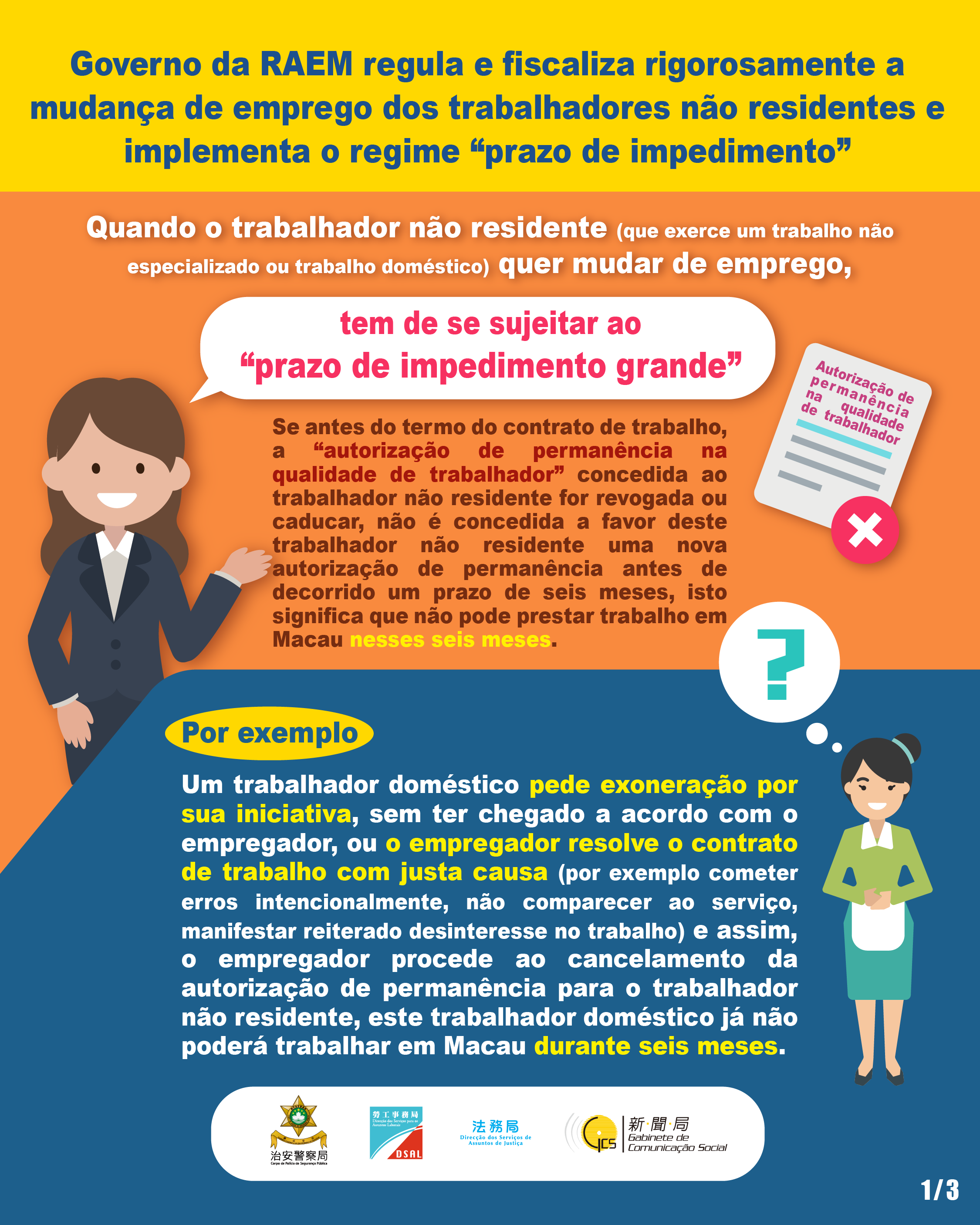 O Governo da RAEM regula e fiscaliza, nos termos da lei, a mudança de emprego dos trabalhadores não residentes, doravante designados por TNRs. Ao abrigo das disposições da vigente Lei da contratação de trabalhadores não residentes, os TNRs podem apenas prestar, em Macau, o serviço ao empregador constante no seu ‘‘título de identificação de trabalhador não residente’’ que é vulgarmente conhecido por “cartão azul” e exercer exclusivamente os trabalhos relativos ao cargo autorizado e constante no “cartão azul”. A lei acima referida dispõe, simultaneamente, do regime “prazo de impedimento” para regular e fiscalizar os fenómenos de os TNRs provocarem propositadamente o seu despedimento e a mudança de emprego.