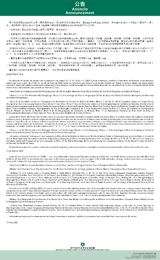 Tendo em consideração a evolução epidemiológica mais actualizada no Interior da China, o s Serviços de Saúde, de acordo com os dispostos nos artigos 10.º e 14.º da Lei n.º 2/2004 (Lei de Prevenção, Controlo e Tratamento de Doenças Transmissíveis), determinam que a partir da 01h00 do dia 20 de Maio de 2022, todos os indivíduos que entrem ou já tenham entrado em Macau e tenham estado nos locais abaixo indicados, devem ser sujeitos à observação médica em local a designar, conforme exigências da autoridade de saúde, por um período de 14 dias a contar da data de saída destes locais, não podendo esse período ser inferior a 7 dias: