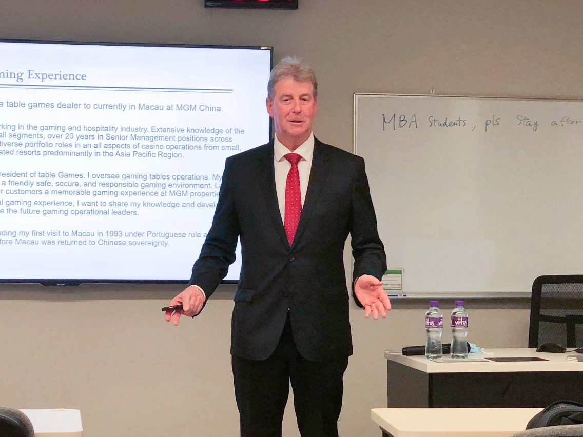 Graeme Croft, durante o seu discurso, partilhou a sua experiência de três décadas na gestão da exploração do jogo na região Ásia-Pacífico, tendo apresentado a estrutura organizacional da operação de mesas de jogo e os diversos jogos oferecidos pelas empresas integradas de turismo e lazer de Macau. Salientou que o sucesso da operação do jogo depende da existência de uma boa equipa e da prestação constante de serviços de qualidade aos clientes. Para além disso, o orador tomou como exemplo a experiência prática do MGM, discutindo com os alunos a importância das medidas de jogo responsável nos casinos.