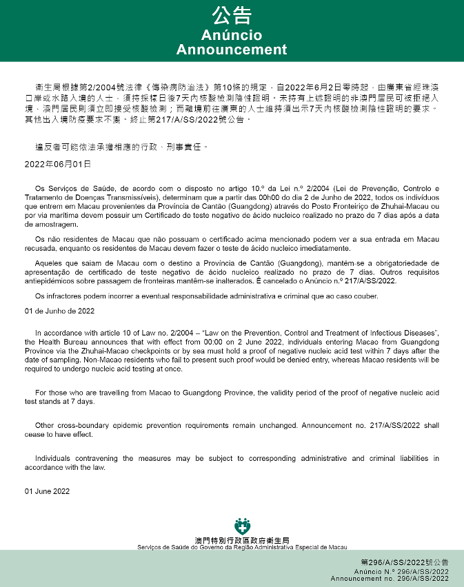 Tendo em consideração a evolução epidemiológica actualizada nas regiões vizinhas e após a obtenção de um acordo através do Mecanismo Conjunto de Prevenção e Controlo de Zhuhai e Macau, os Serviços de Saúde, de acordo com os dispostos no artigo 10.º da Lei n.º 2/2004 (Lei de Prevenção, Controlo e Tratamento de Doenças Transmissíveis), determinam que a partir das 00h00 do dia 2 de Junho de 2022, todos os indivíduos que entrem em Macau provenientes da Província de Cantão (Guangdong) através do Posto Fronteiriço de Zhuhai-Macau ou por via marítima devem possuir um Certificado de teste negativo de ácido nucleico realizado no prazo de 7 dias após a data de amostragem.