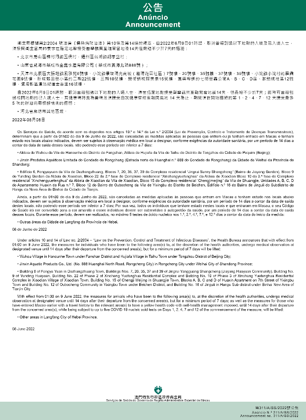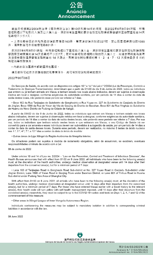 Tendo em consideração a evolução epidemiológica mais actualizada no Interior da China, os Serviços de Saúde, de acordo com os dispostos nos artigos 10.º e 14.º da Lei n.º 2/2004 (Lei de Prevenção, Controlo e Tratamento de Doenças Transmissíveis), determinam que a partir da 01h00 do dia 9 de Junho de 2022, todos os indivíduos que entrem ou já tenham entrado em Macau e tenham estado nos locais abaixo indicados, devem ser sujeitos à observação médica em local a designar, conforme exigências da autoridade sanitária, por um período de 14 dias a contar da data de saída destes locais, não podendo esse período ser inferior a 7 dias: