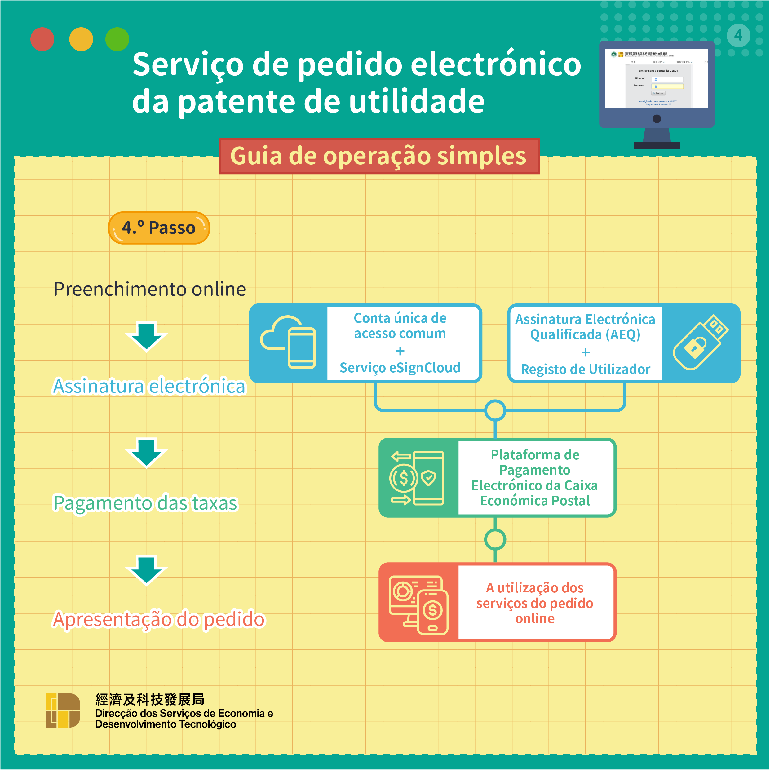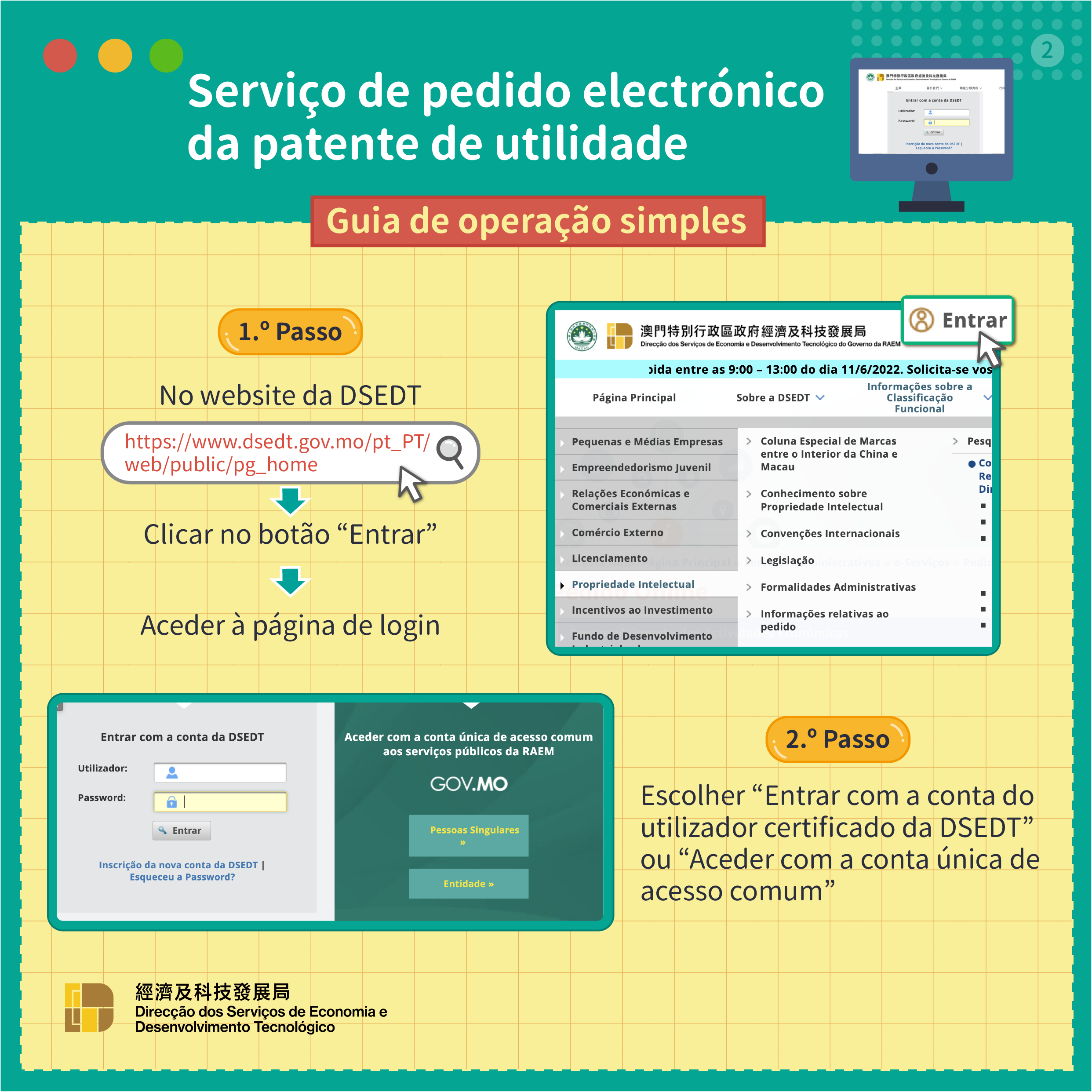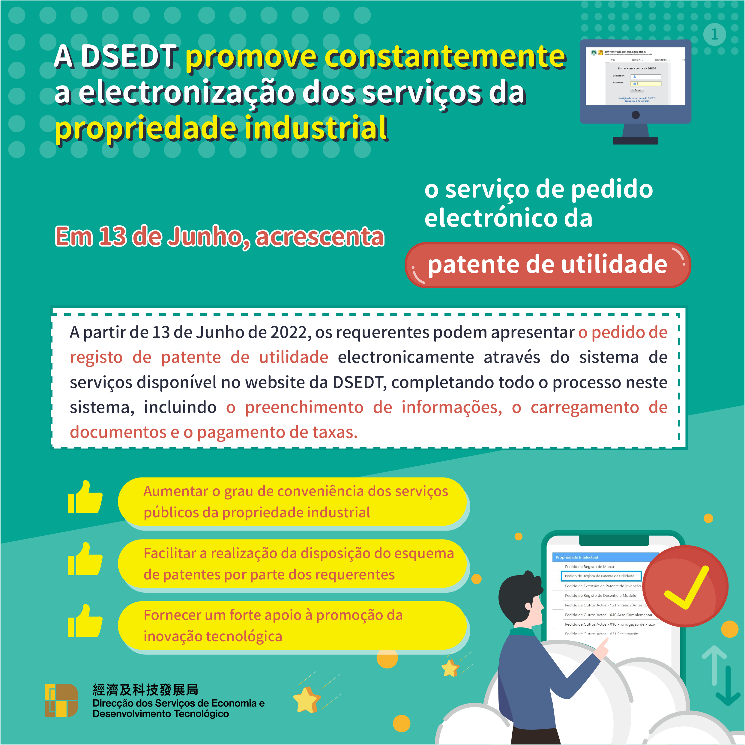 Para promover constantemente o desenvolvimento do governo electrónico, prestando serviços públicos de boa qualidade mais convenientes aos cidadãos e às empresas, a Direcção dos Serviços de Economia e Desenvolvimento Tecnológico (DSEDT) acrescentará, a partir de 13 de Junho de 2022, o “serviço de pedido electrónico da patente de utilidade”. Os requerentes podem apresentar os seus pedidos de registo de patentes de utilidade electronicamente através do sistema de serviços do website da DSEDT, e completando todo o processo, incluindo o preenchimento de informações, o carregamento de documentos e o pagamento de taxas.