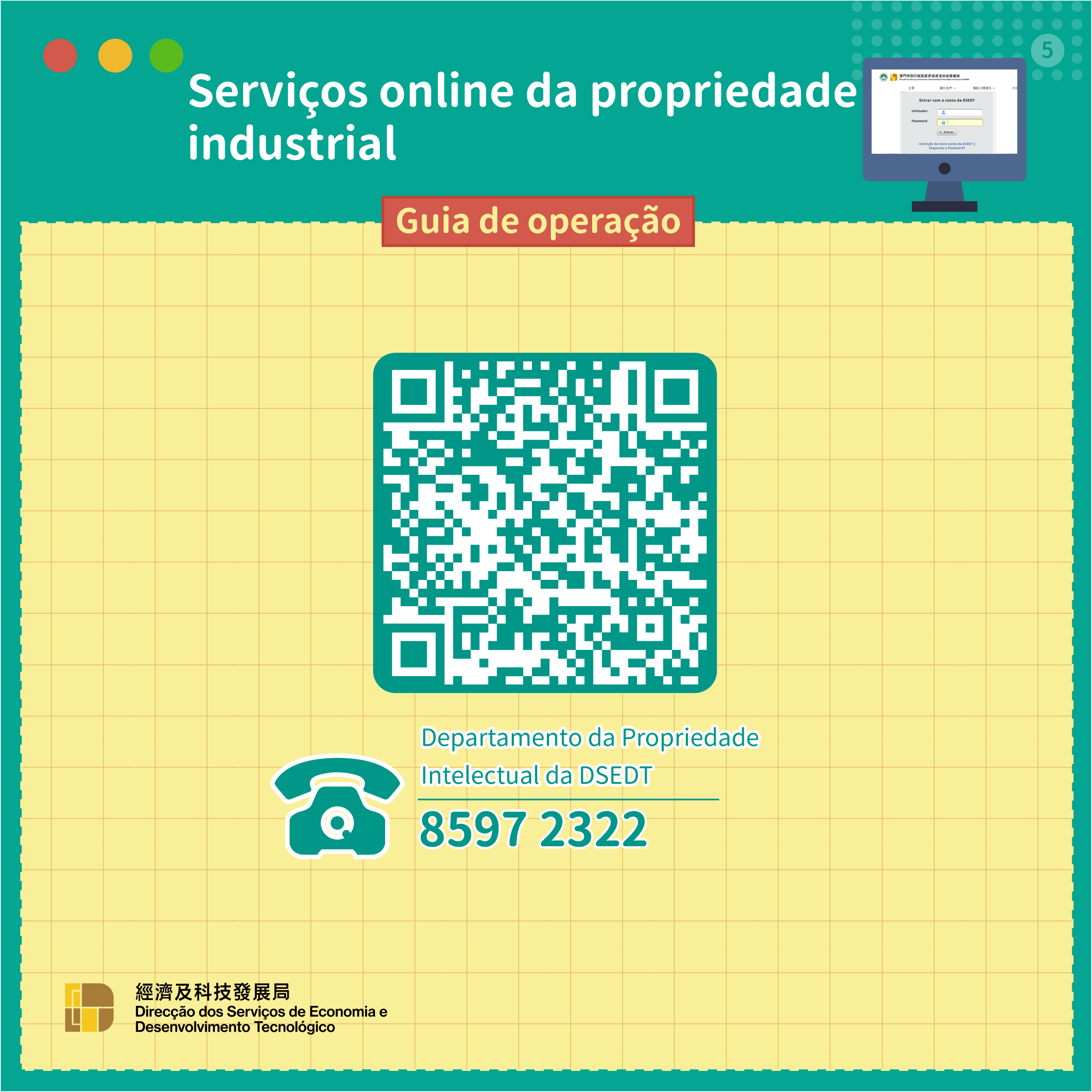 Para mais informações sobre os diferentes serviços online da propriedade intelectual, podem consultar o guia de utilização na página electrónica da DSEDT (https://www.dsedt.gov.mo/pt_PT/web/public/pg_ip_os?_refresh=true), ou contactar o Departamento da Propriedade Intelectual (Tel: 8597 2229) durante o horário de expediente.