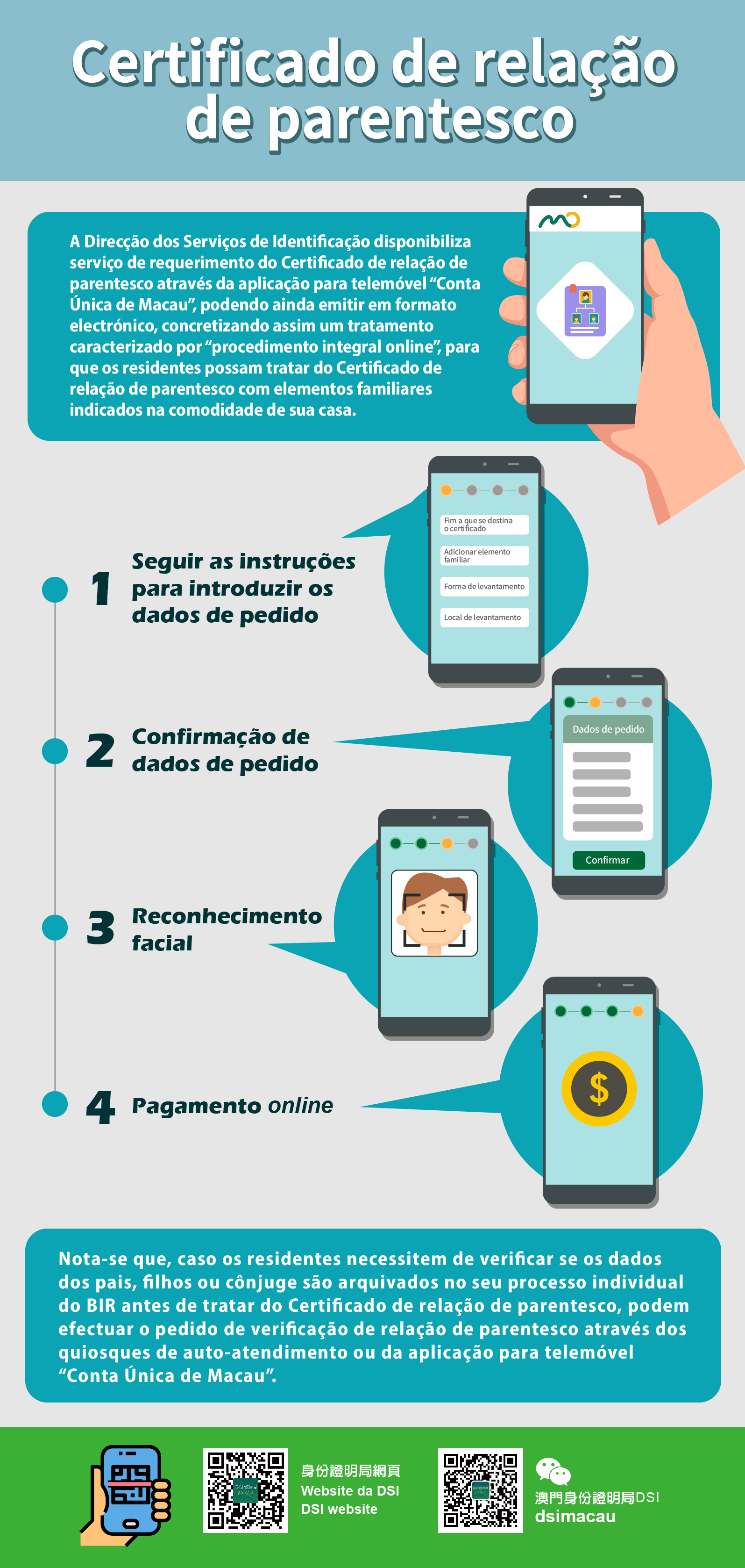 Para mais informações sobre o serviço online de requerimento do Certificado de relação de parentesco, queria consultar o site www.dsi.gov.mo/webservice_p.jsp.