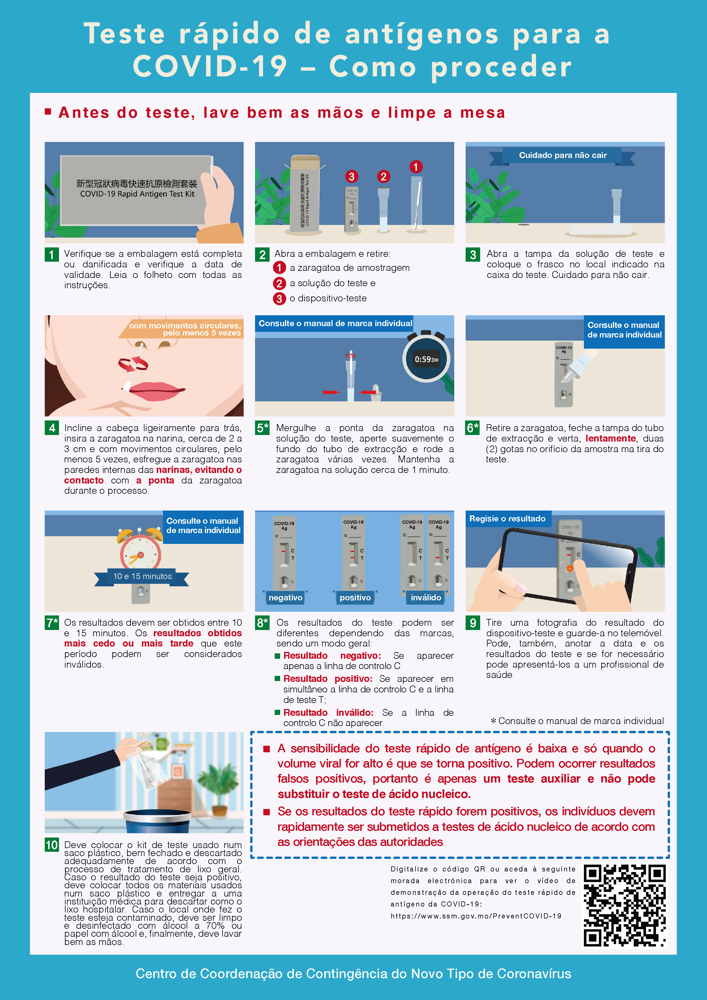 Os procedimentos, declaração de resultado e precauções relativas ao uso do teste rápido de antigénio, estão disponíveis na seguinte página electrónica: https://www.ssm.gov.mo/apps1/covidagtest/pt.aspx#clg21987.