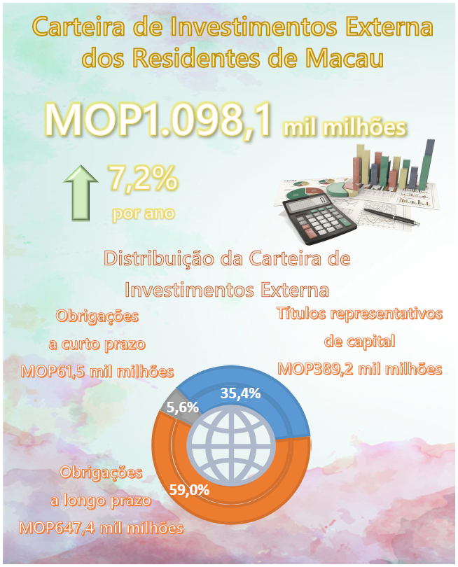 Nas estatísticas divulgadas pela Autoridade Monetária de Macau constata-se que os investimentos dos residentes de Macau - incluindo os indivíduos, governo e outras pessoas colectivas, mas excluindo as reservas cambiais da Região Administrativa Especial de Macau (RAEM) - em títulos emitidos por entidades não residentes independentes, calculados a preços de mercado em 31 de Dezembro de 2021, registaram um valor de 1.098,1 mil milhões de patacas, ou seja, +1,9% face a 30 de Junho de 2021 e +7,2% face ao final do ano 2020. Entre os vários componentes da carteira, os investimentos em títulos representativos de capital (incluindo fundos mútuos e investimentos em trusts), obrigações a longo prazo e obrigações a curto prazo alcançaram, respectivamente, 389,2 mil milhões, 647,4 mil milhões e 61,5 mil milhões de patacas em valor de mercado, traduzindo aumentos respectivos de 12,4%, 4,3% e 6,6% em relação ao final de 2020.
