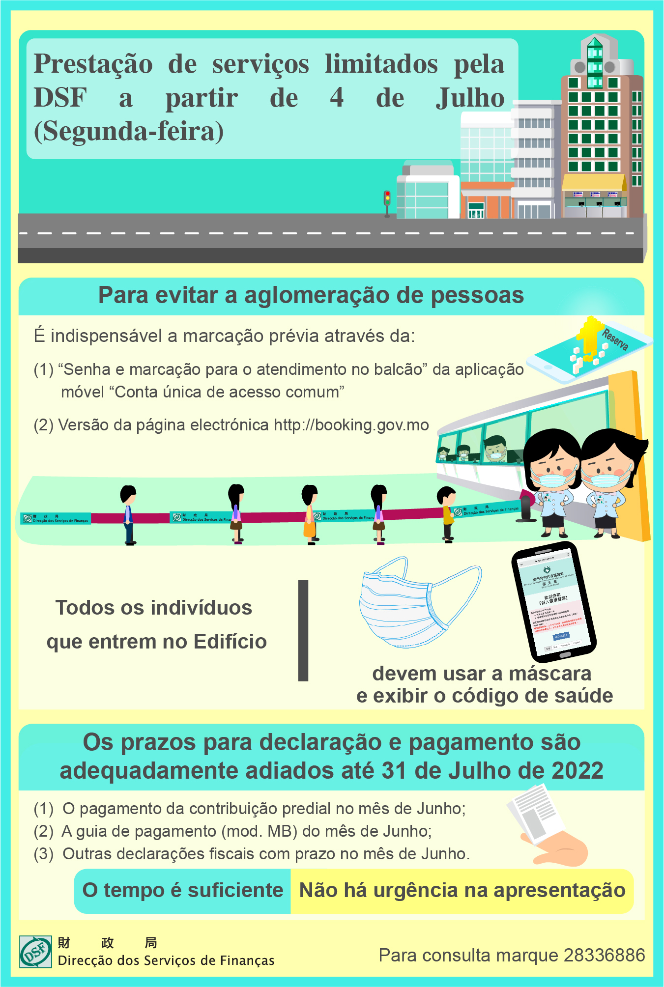 A DSF reinicia, a 4 de Julho (segunda-feira), a prestação de serviços limitados, e para evitar a aglomeração de pessoas, os cidadãos devem efectuar a marcação prévia de serviços através da função de "Senha e marcação para o atendimento no balcão" na aplicação móvel "Conta única de acesso comum" e na sua página electrónica (http://booking.gov.mo). Além disso, todos os indivíduos que entrarem no Edifício "Finanças" devem usar a máscara e exibir o código de saúde.