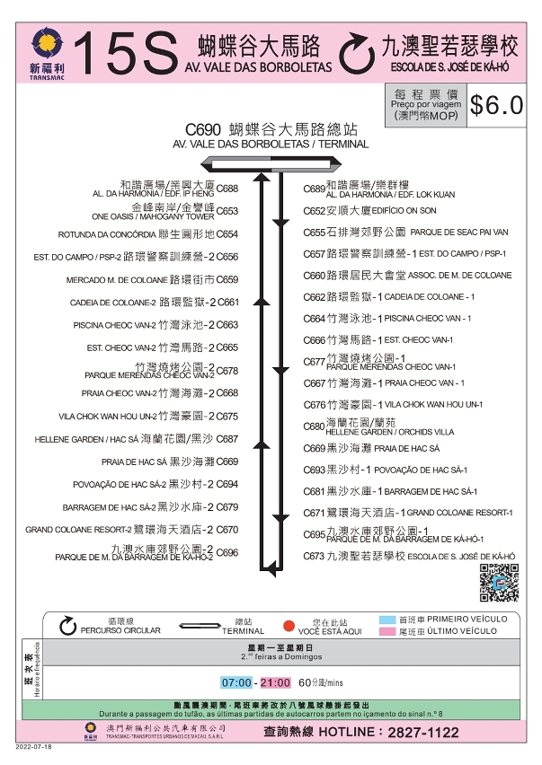 Depois de analisar o funcionamento de 30 carreiras especiais nos últimos dias, tendo em conta o ambiente geográfico de Coloane e as necessidades de deslocação básica dos residentes das zonas remotas nos seus bairros, a Direcção dos Serviços para os Assuntos de Tráfego (DSAT), definiu que de 18 a 22 de Julho, será disponibizada a carreira especial n.o 15 (15S) com paragem no Terminal da AV. Vale das Borboletas, Vila de Coloane, Praia Cheoc Van, Praia de Hac Sá e Escola de S. José de Ká-Hó (vide o itinerário).