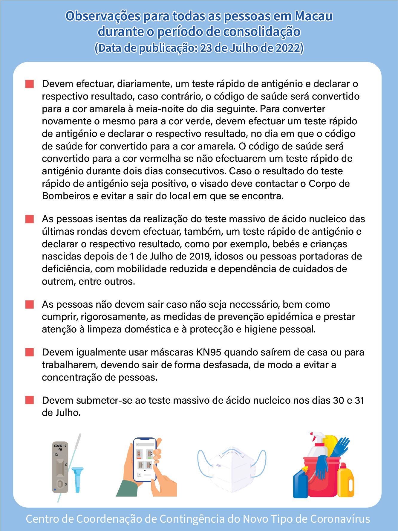 O Centro de Coordenação de Contingência do Novo Tipo de Coronavírus informa que, a fim de estabelecer a articulação com as medidas antiepidémicas adoptadas durante o período de consolidação, serão realizados testes de ácido nucleico destinados aos grupos-chave e grupo de trabalhadores, com necessidade de sair de casa para o trabalho, nos 6 dias consecutivos entre 24 (Domingo) a 29 (Sexta-feira) de Julho: é necessário efectuar um teste de ácido nucleico, dia a dia para os grupos-chave e um teste em cada 2 dias para o grupo de trabalhadores, com necessidade de sairem de casa para o trabalho.