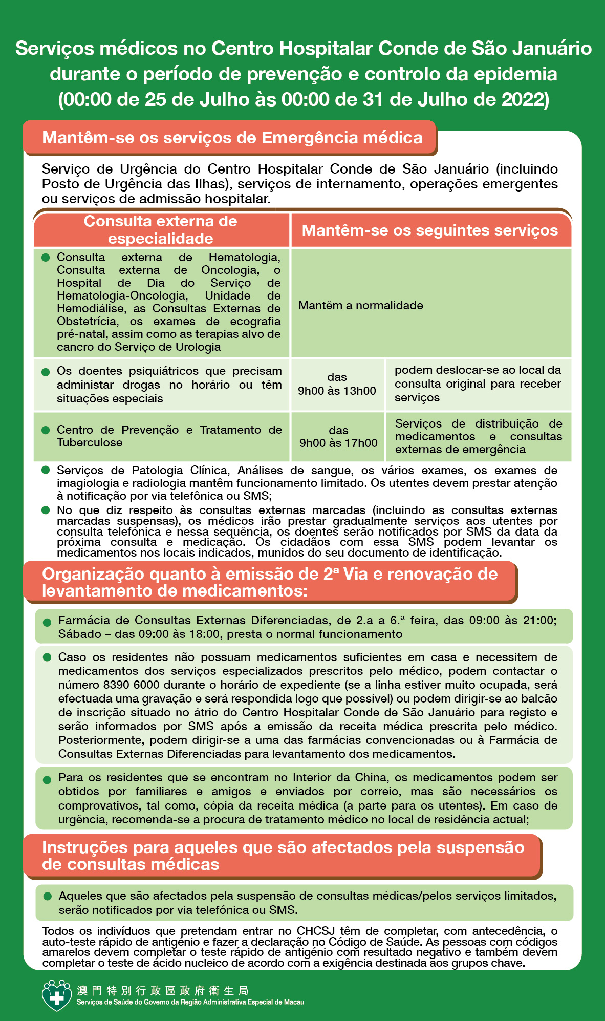Para cooperar com as várias medidas contra a epidemia promovidas pelo Governo da Região Administrativa Especial de Macau durante o período de consolidação da prevenção e controlo da epidemia, os serviços médicos do Centro Hospitalar Conde de São Januário, Centros/Postos de Saúde, emissão de 2ª. Via e renovação do levantamento de medicamentos são disponibilizados da seguinte forma, a partir das 00:00 do dia 25 até às 00:00 do dia 31 de Julho:
