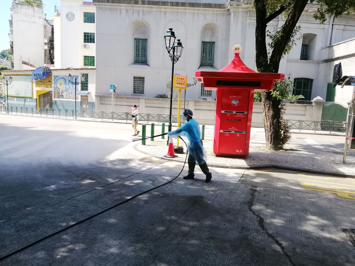 Desde o início do actual surto de casos positivos, o IAM, de acordo com as orientações antiepidémicas emitidas pelos Serviços de Saúde, tem coordenado constantemente com a CSR Macau para destacar mais pessoal e veículos de limpeza de ruas para todos os bairros de Macau, limpando as vias pedonais e rodoviárias com pistola de água de alta pressão e alvejante diluído. Simultaneamente, duplicou o números de trabalhadores enviados para proceder à limpeza, com alvejante diluído, dos corrimãos das escadas rolantes, abrigos para paragens de autocarros, placas indicadoras das paragens, parquímetros e outras instalações públicas, e à pulverização com líquido desinfectante das bocas de esgoto públicas, corrimãos e vedações das vias pedonais, a fim de garantir a higiene e a limpeza ambiental dos bairros.