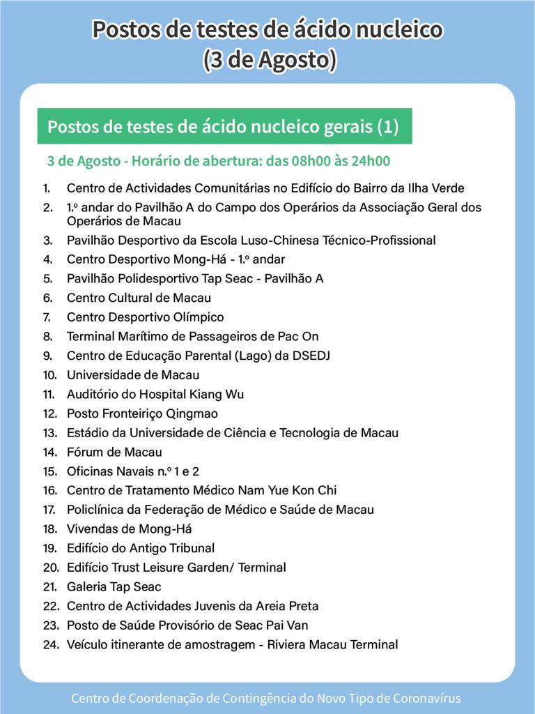 | Postos de Testes Pagos (Marcação obrigatória, resultado exibido no código de saúde e fornecido em forma de papel) |