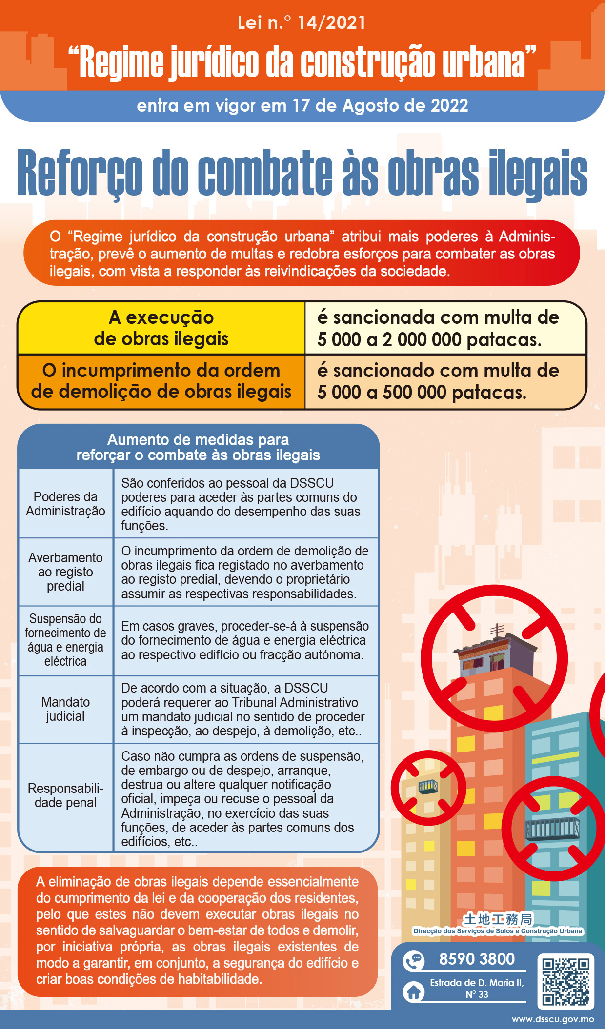 Para combater as novas obras ilegais e incentivar os cidadãos a demolir, por iniciativa própria, as obras ilegais existentes nas suas fracções autónomas, o novo regime, para além de definir as responsabilidades dos proprietários de estabelecimentos onde existem obras ilegais e dos responsáveis pela execução de obras ilegais, prevê outras medidas de combate e sanções mais graves, nomeadamente a implementação de dois procedimentos de aplicação de multas, ou seja, o infractor pode ser punido, em simultâneo, com uma multa pela prática de infracção de execução de obras ilegais e com uma multa pelo incumprimento da ordem de demolição de obras ilegais que varia entre 5 000 e 500 000 patacas. De acrescentar que em relação às infracções graves, poder-se-á suspender o fornecimento de água e energia eléctrica, e que nos casos de incumprimento da ordem de demolição, a DSSCU pode comunicar este incumprimento à Conservatória do Registo Predial para efeitos de averbamento à respectiva descrição predial