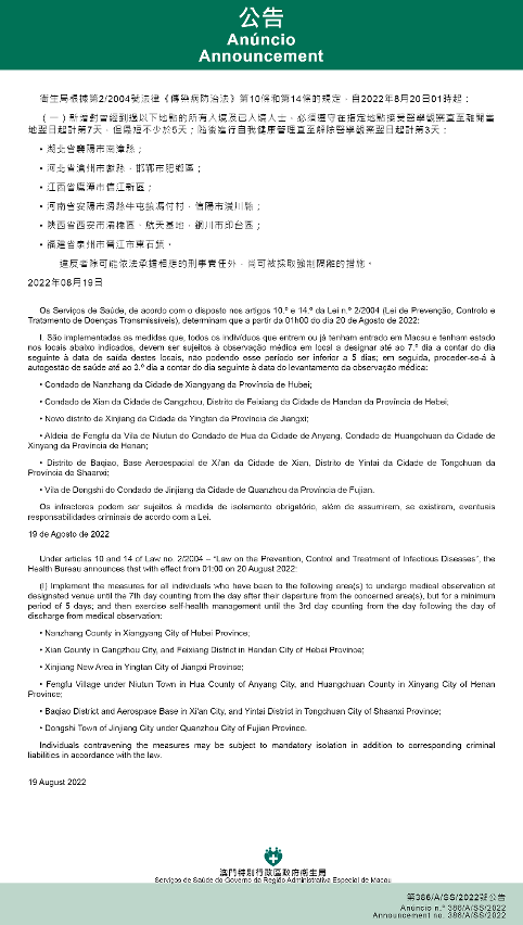 Tendo em consideração a evolução epidemiológica mais actualizada no Interior da China, os Serviços de Saúde, de acordo com o disposto nos artigos 10.º e 14.º da Lei n.º 2/2004 (Lei de Prevenção, Controlo e Tratamento de Doenças Transmissíveis), determinam que a partir da 01h00 do dia 20 de Agosto de 2022, são implementadas ou canceladas as medidas antiepidémicas para quem tenha estado em diversas áreas do Interior da China: