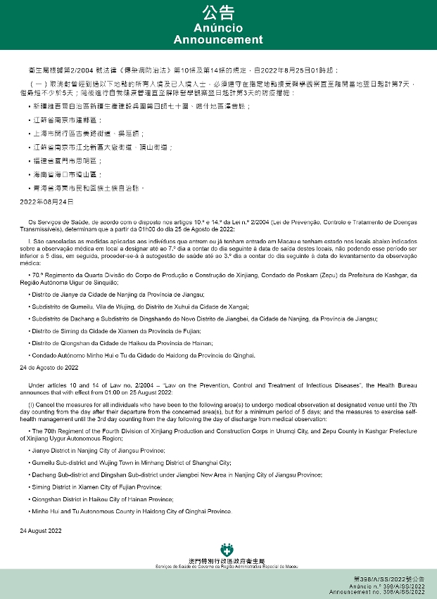 Tendo em consideração a evolução epidemiológica mais actualizada no Interior da China, os Serviços de Saúde, de acordo com o disposto nos artigos 10.º e 14.º da Lei n.º 2/2004 (Lei de Prevenção, Controlo e Tratamento de Doenças Transmissíveis), determinam que a partir da 01h00 do dia 25 de Agosto de 2022, são implementadas ou canceladas as medidas antiepidémicas para quem tenha estado em diversas áreas do Interior da China: