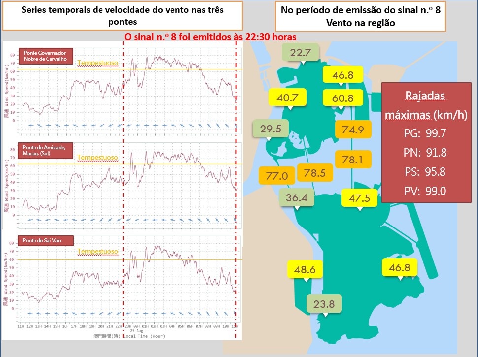 Devido ao impacto de tempestade tropical "Ma-on", ontem (24), esta Direcção emitiu, às 22:30 horas, o terceiro sinal n.º 8 deste ano. Durante o período, a intensidade dos ventos máximos sustentados numa média de 10 minutos, registados nas três pontes, foi no nível 8 - 9 da escala "Beaufort", com rajadas máximas do nível 10 (Fig. 1). Com o afastamento de “Ma-on”, esta Direcção foi emitido o sinal n.o 3 às 11:00 horas.
