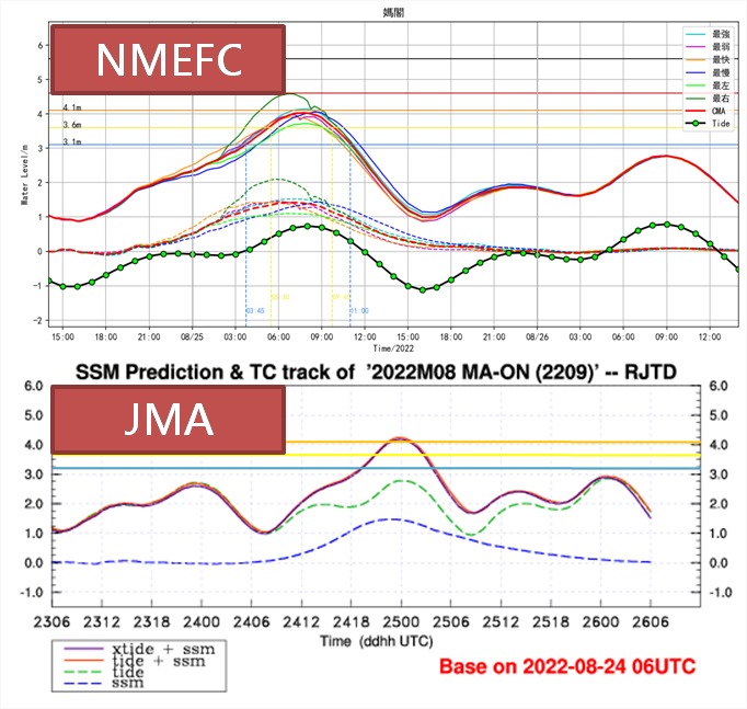 De acordo com os resultados de saída do modelo de previsão de Storm Surge às 14:00 horas do dia 24 (Figura 5), a maioria deles revela que o "Ma-on" causaria inundações na manhã do dia 25 e havia potencial de atingir o nível de Storm Surge laranja; ao mesmo tempo, conforme mencionado num comunicado (extra informação) desta Direcção, se uma tempestade tropical com um nível de ciclone tropical severo ou superior, passar a menos de 200 km a Oeste de Macau durante o período de maré alta, pode causar inundações com uma altura máxima compreendida entre 1 e 1,5 m. Embora "Ma-on" tenha finalmente se intensificado a um nível de tufão e passado cerca de 160 km a Oeste de Macau, sua velocidade de movimento foi mais rápida do que esperado, trajectória geral e local onde atingiu terra, foram mais a Oeste do que esperado, o que afectou a severidade de Storm Surge, o que também faz a hora da maré alta astronómica e o “Storm Surge” fossem obviamente desfasados. Devido a estes dois factores, a situação das inundações na manhã do dia 25 não foi tão grave como o que esperado.