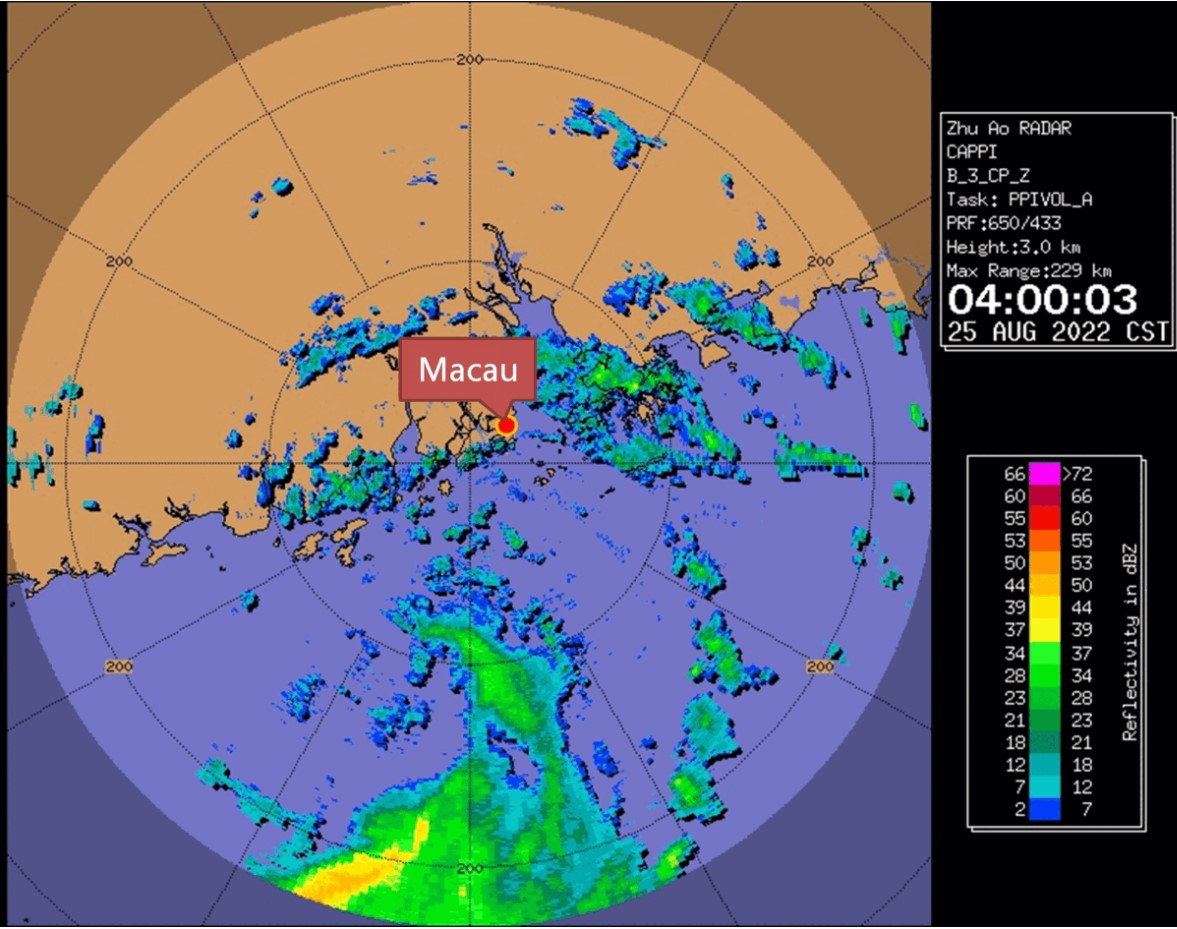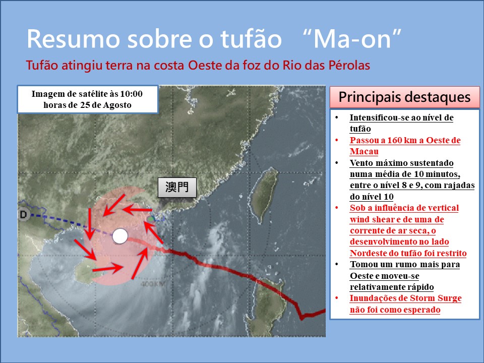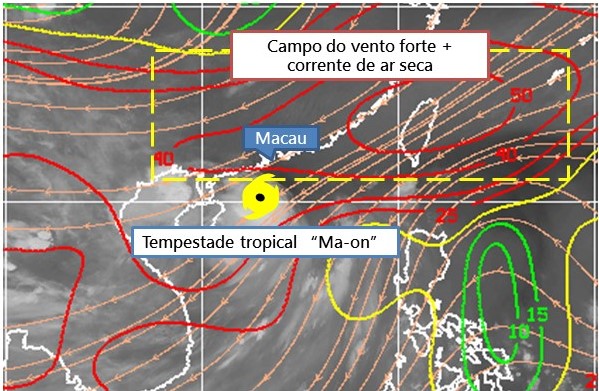 Embora "Ma-on" se tenha intensificado a um nível de tufão à medida que se aproximava da costa de Guangdong, devido ao impacto de vertical wind shear na parte Norte do Mar do Sul da China e à influência de corrente de ar mais seca no lado Nordeste deste sistema (Figura 3), o desenvolvimento das faixas de chuvas foi restrito. As chuvas fortes concentraram-se a Sul do sistema (Fig. 4), e Macau localizado a Norte. Até às 12:00 horas de dia 25, a precipitação acumulada, registada, no período de emissão do sinal n.o 8, em várias zonas de Macau, foi apenas cerca de 10,0 mm.