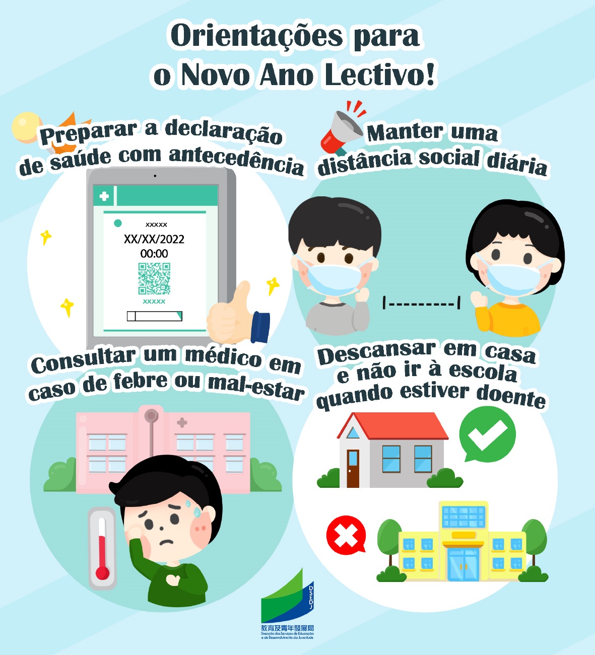 Tendo em conta que o novo ano lectivo terá início em breve, a Direcção dos Serviços de Educação e de Desenvolvimento da Juventude (DSEDJ) apela a todos os pais/encarregados de educação e estudantes para prepararem mais cedo o início do novo ano lectivo, prestando atenção às informações mais actualizadas relativas ao trânsito e às condições meteorológicas e sobre a epidemia divulgadas pelo Governo da RAEM.