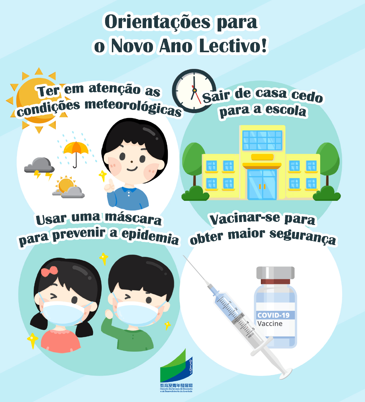 Para proteger a saúde pessoal, dos familiares e do público, a DSEDJ apela fortemente para que os estudantes, que tenham completado 3 anos de idade, se vacinem contra a COVID-19, com a maior brevidade, encorajando os docentes e estudantes, que reúnem os requisitos necessários, a submeterem-se à vacinação do esquema vacinal completo e à dose de reforço, o mais rápido possível.