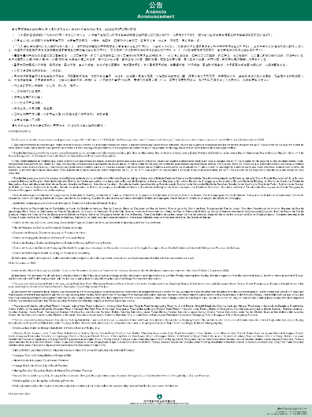 Tendo em consideração a evolução epidemiológica mais actualizada no Interior da China, os Serviços de Saúde, de acordo com o disposto nos artigos 10.º e 14.º da Lei n.º 2/2004 (Lei de Prevenção, Controlo e Tratamento de Doenças Transmissíveis), determinam que a partir da 01h00 do dia 2 de Setembro de 2022, são implementadas ou canceladas as medidas antiepidémicas para quem tenha estado em diversas áreas do Interior da China: