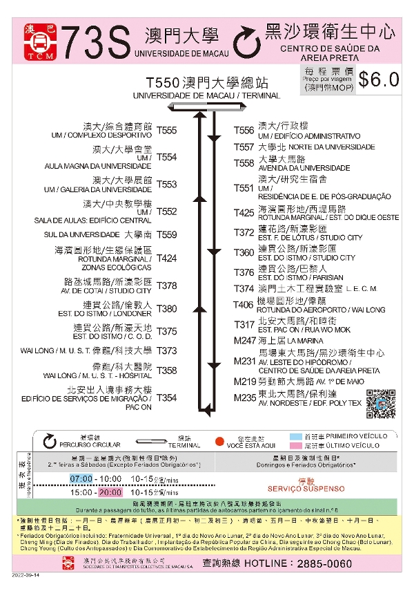 - A carreira especial do n.º 73 (73S) tem as novas escalas no Laboratório de Engenharia Civil de Macau, no Studio City e na Estrada For de Lótus, que permite aos docentes e discentes da Universidade de Macau e da Universidade de Ciência e Tecnologia de Macau fazerem a correspondência de transportes, via a carreira n.º 701X, até ao Posto Fronteiriço de Hengqin.