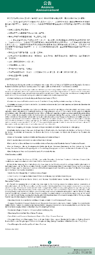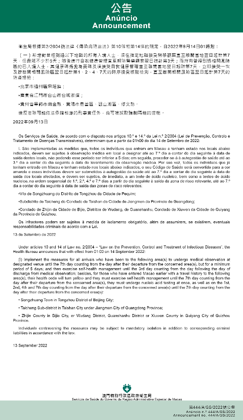 Tendo em consideração a evolução epidemiológica mais actualizada no Interior da China, os Serviços de Saúde, de acordo com o disposto nos artigos 10.º e 14.º da Lei n.º 2/2004 (Lei de Prevenção, Controlo e Tratamento de Doenças Transmissíveis), determinam que a partir da 01h00 do dia 14 de Setembro de 2022, são implementadas ou canceladas as medidas antiepidémicas para quem tenha estado em diversas áreas do Interior da China: