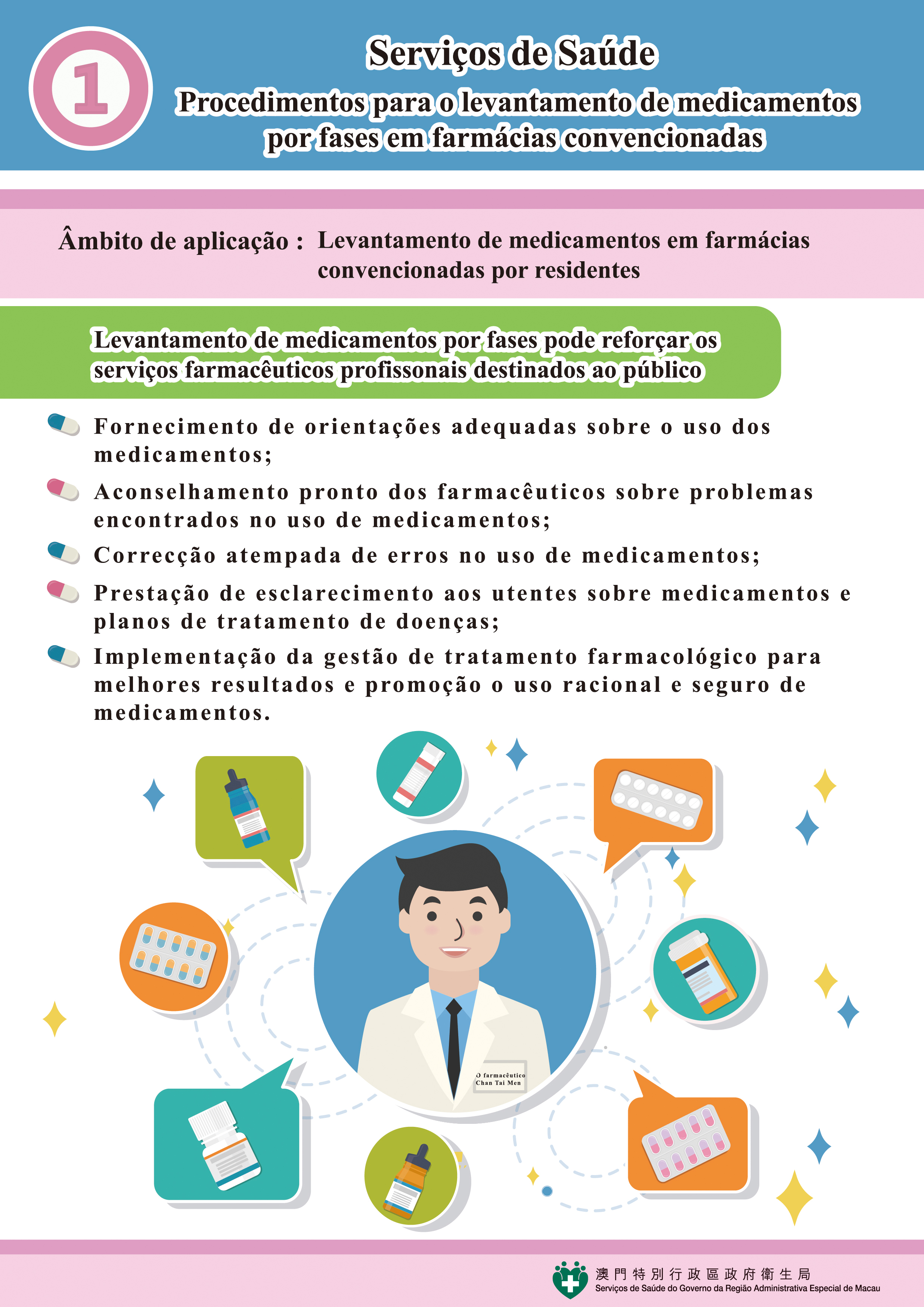 A partir de amanhã (dia 16), os Serviços de Saúde implementarão as medidas de levantamento de medicamentos, por fases em farmácias convencionadas, a partir de amanhã (dia 16), para que os utentes obtenham um conhecimento profundo sobre o tratamento de medicamentos, com a promoção do uso seguro de medicamentos, e a redução do desperdício causado por eventual açambarcamento de medicamentos. Essas medidas, podem, ainda, reforçar o contacto e a comunicação entre os farmacêuticos e os utentes, com vista a que os farmacêuticos possam adequar, com a maior brevidade possível, a questão da administração de medicamentos por parte dos utentes, e procederem à intervenção oportuna e aumentar a eficácia do tratamento por medicamentos, a fim de elevar os serviços profissionais farmacêuticos prestados. Os Serviços de Saúde alertam, mais uma vez, os utentes que devem prestar atenção ao conteúdo seguinte: